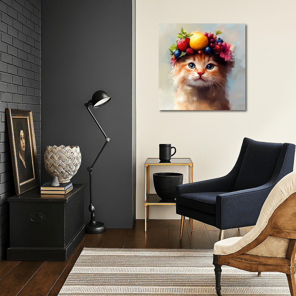 Poster Fruit Mood: adorable kitten with a wreath of berries and fruits. Perfect wall art for a bright interior! See more from the collection: Animals Art
