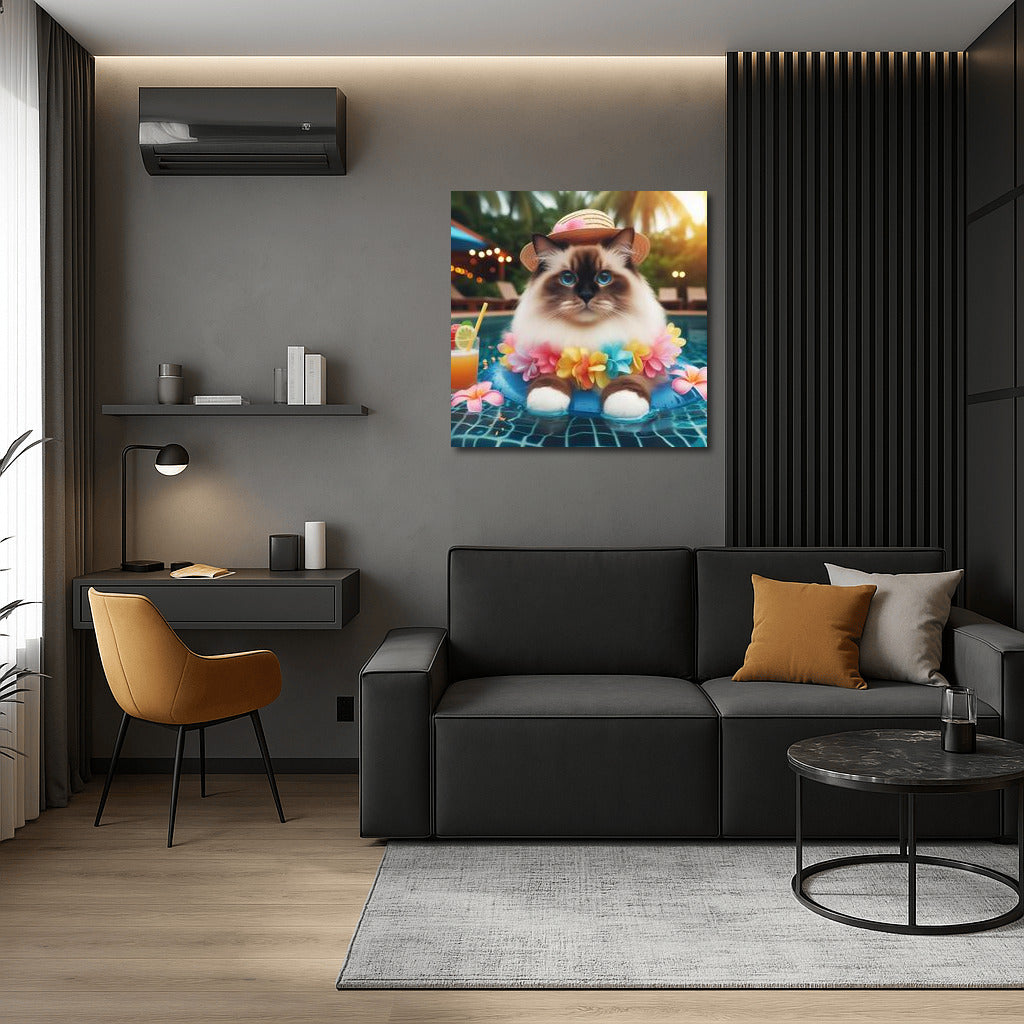 This painting will liven up your interior: Birman at a beach party! A bright poster with a cat in a hat by the pool will add mood. See more from the collection: Animals Art