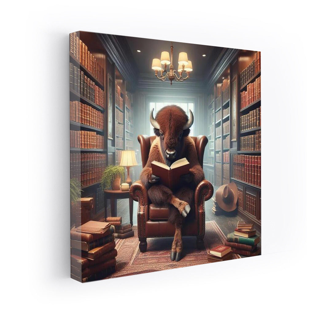 Immerse yourself in the comfort of the library with our poster: a bison reading in a chair, creating an atmosphere of coziness and intelligence. Wall art. See more from the collection: Animals Art