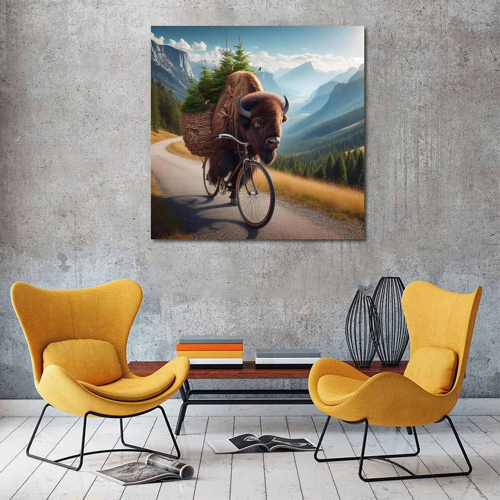 A great poster featuring a bison on a bicycle conquering mountain trails, creating a whimsical atmosphere and interior inspiration. See more from the collection: Animals Art