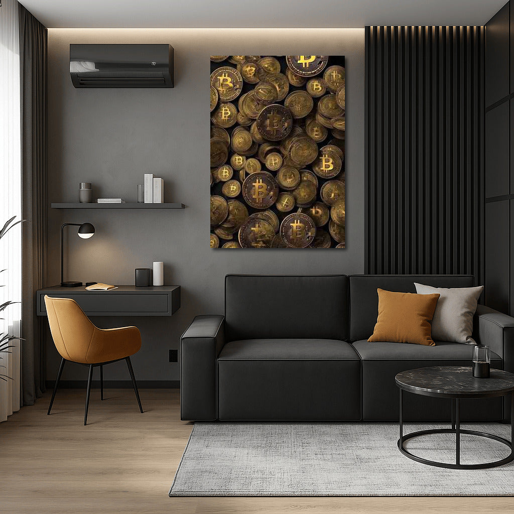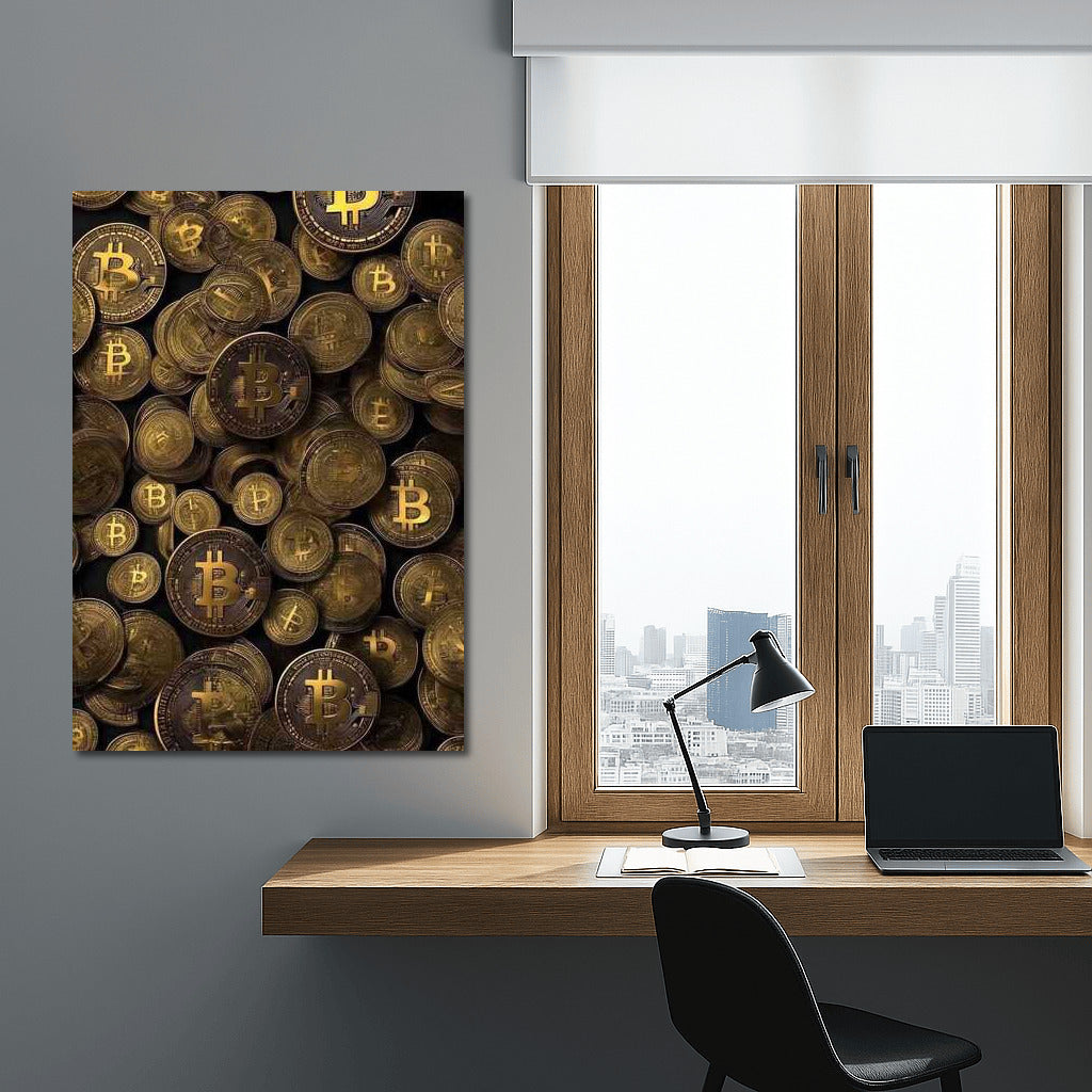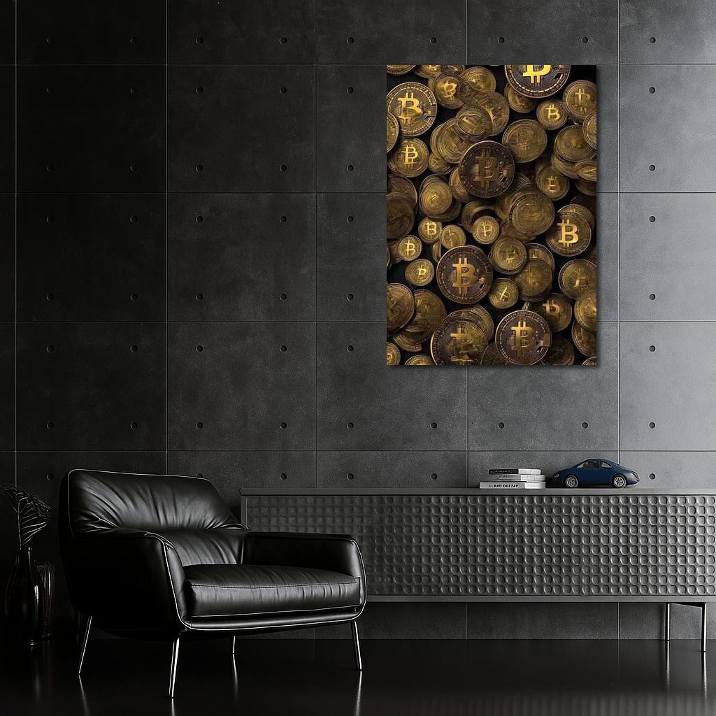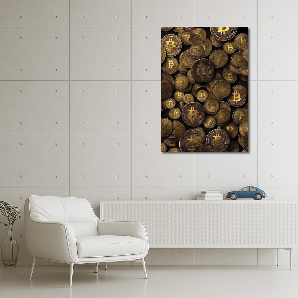 Dive into the world of cryptocurrency with this dynamic poster where Bitcoin coins create exciting wall art. See more from the collection: Cryptocurrency Art