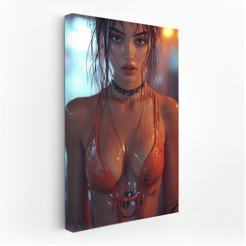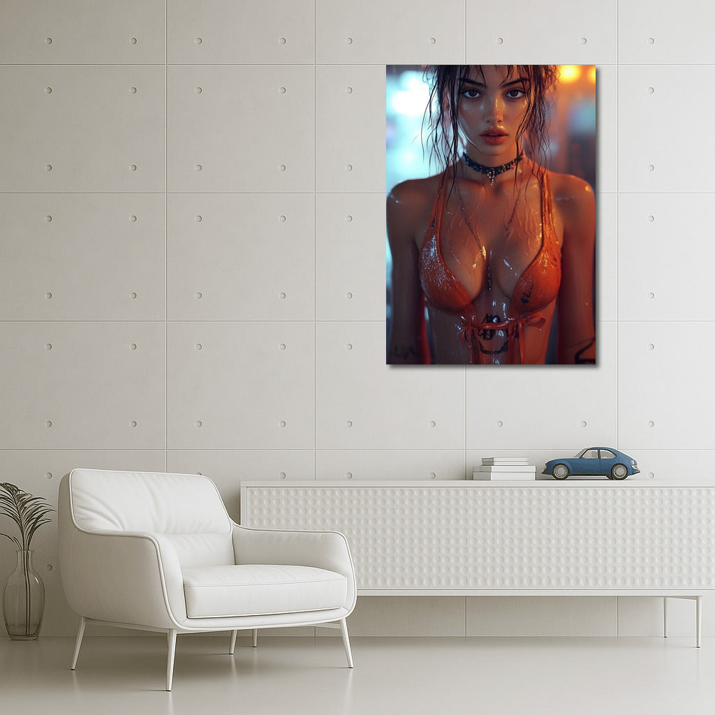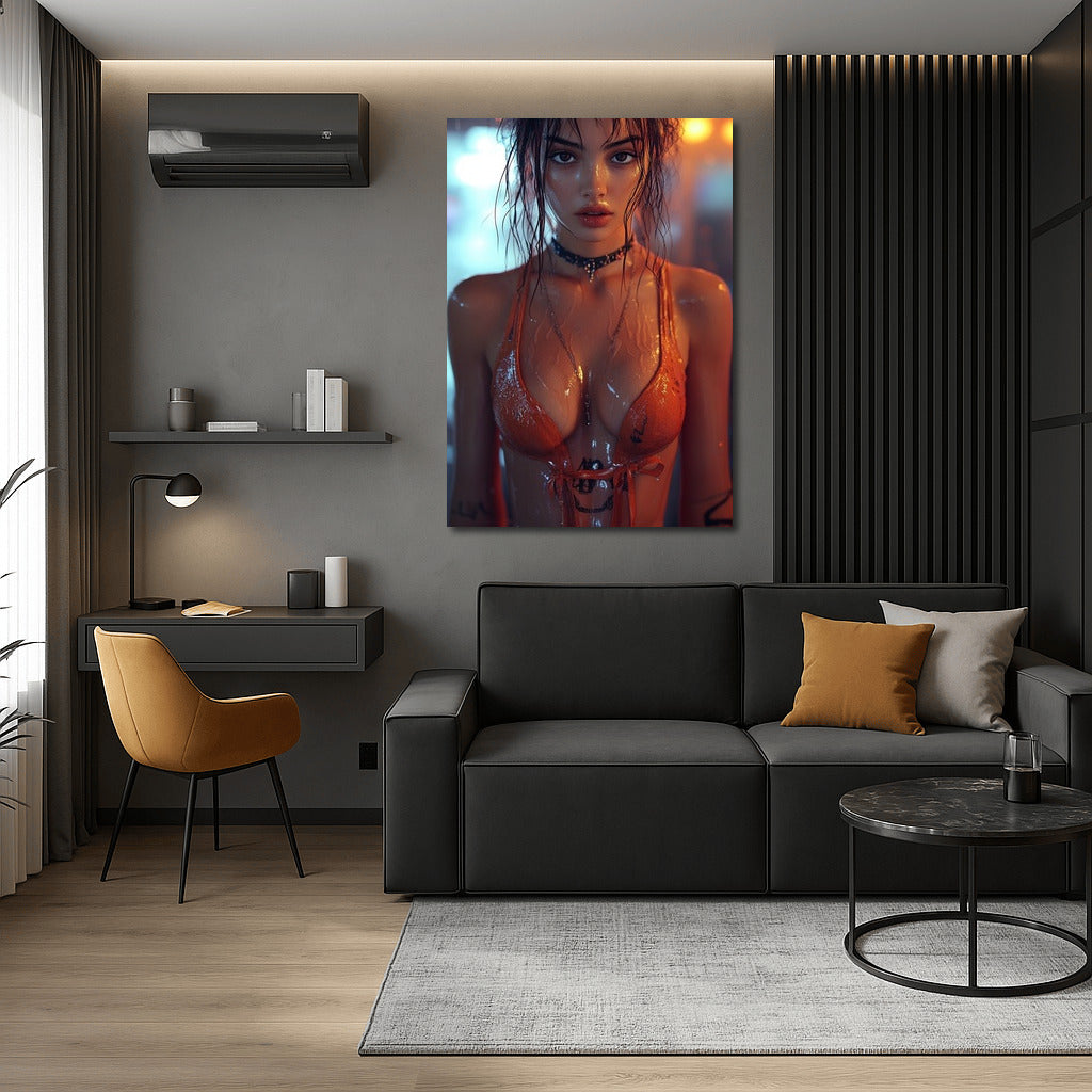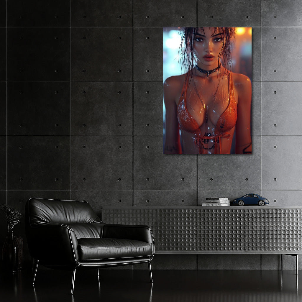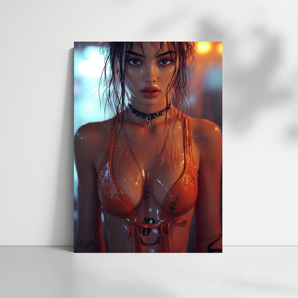 A vibrant poster featuring a captivating figure immersed in light and shadow. Contemporary wall art that brings life to the interior. See more from the collection: Wall Art with Women