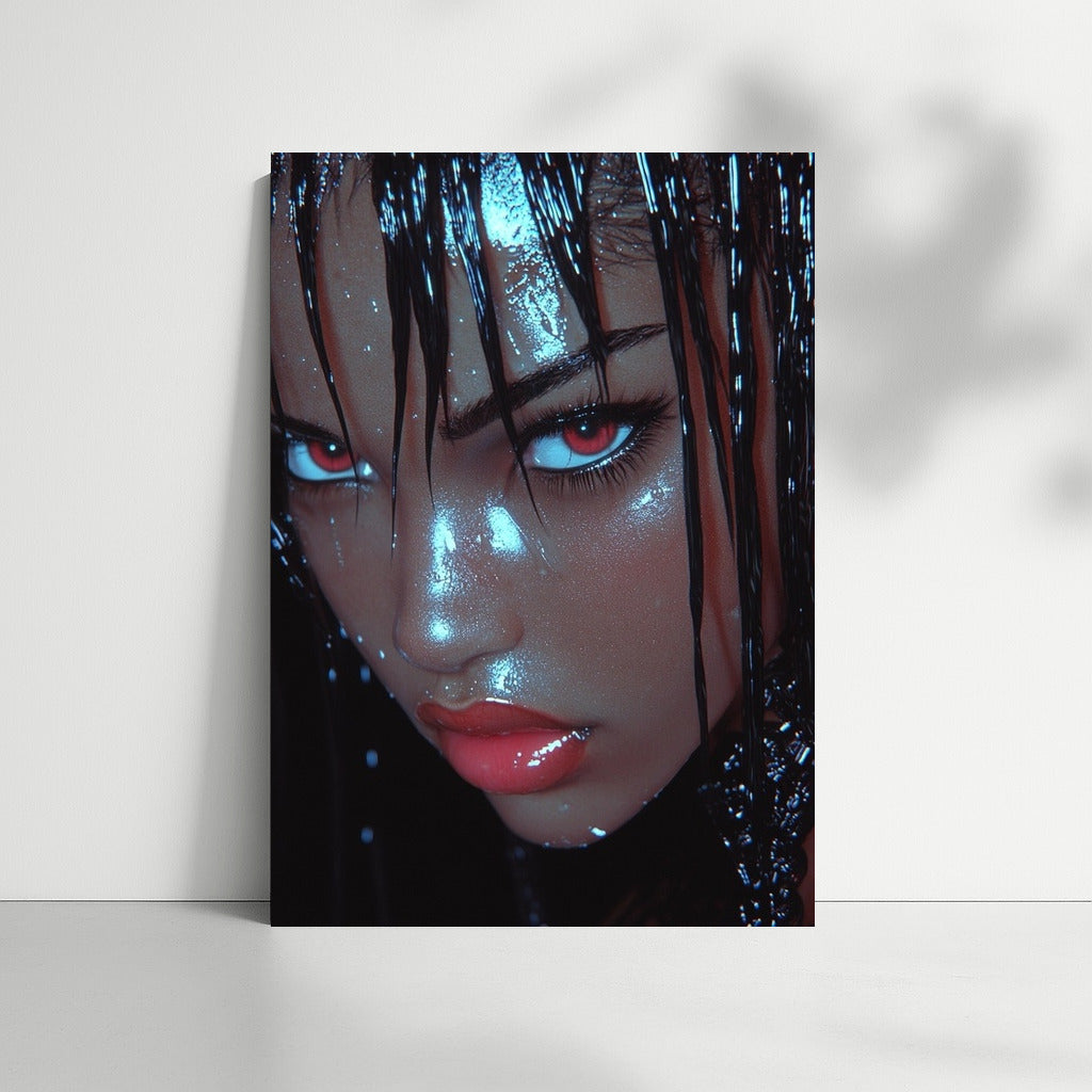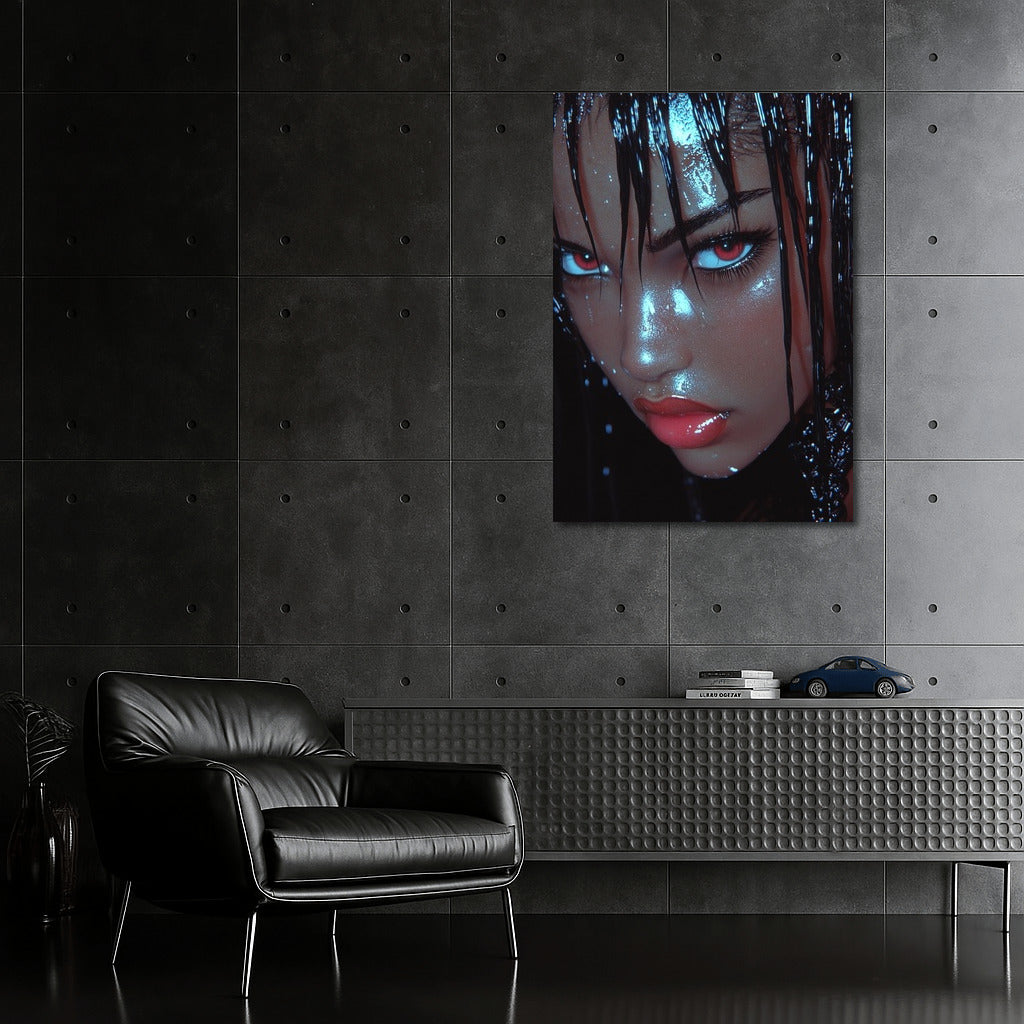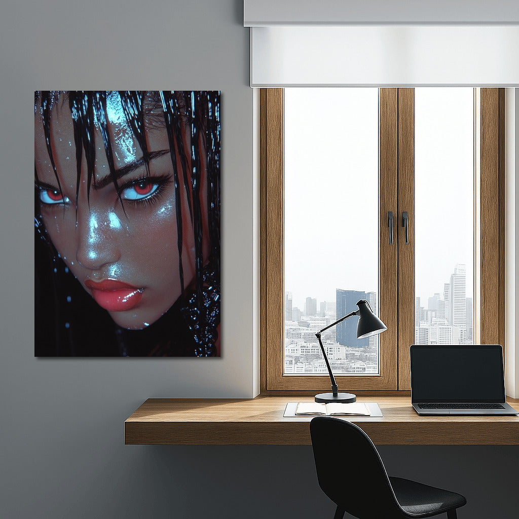 The image of a mysterious girl on a poster comes to life, capturing the play of light and shadow. Wall art of the future. See more from the collection: Wall Art with Women