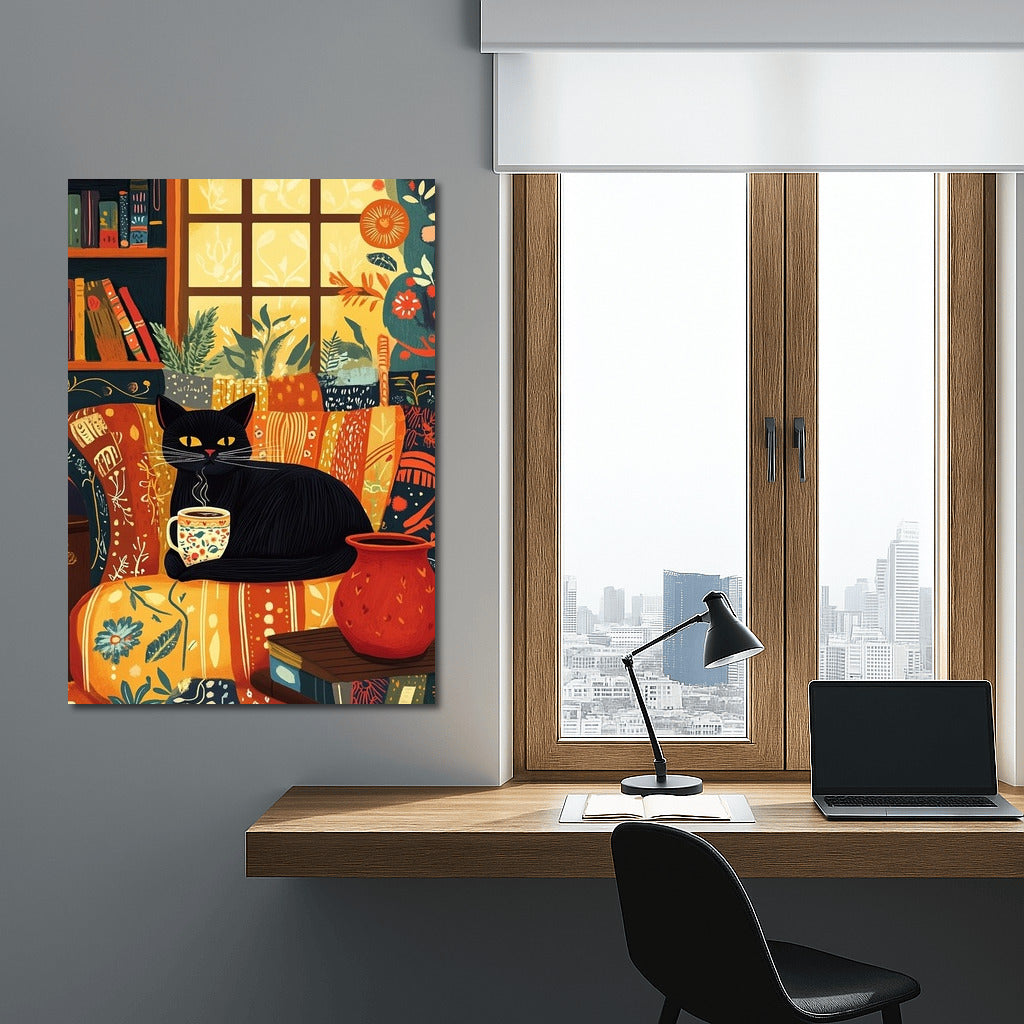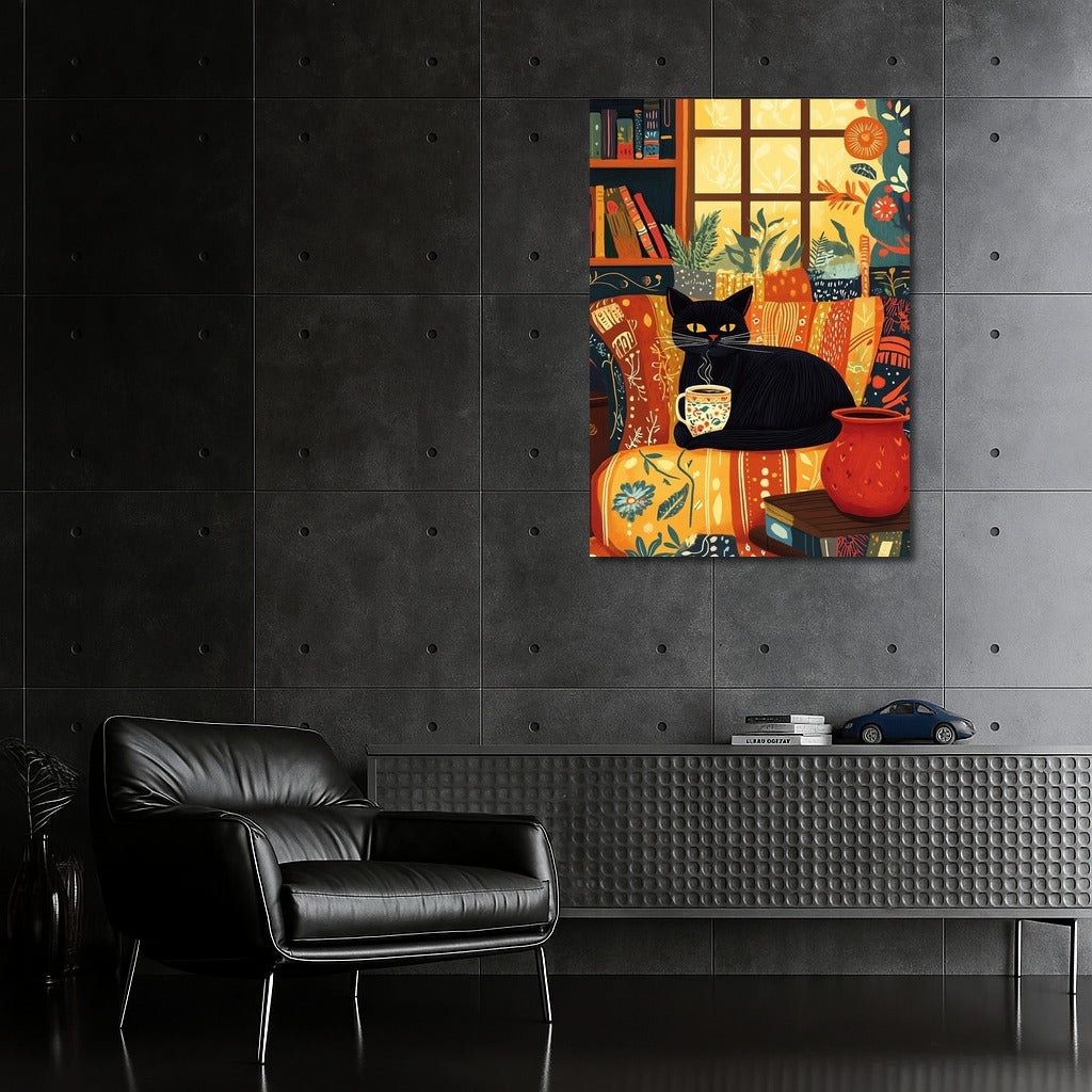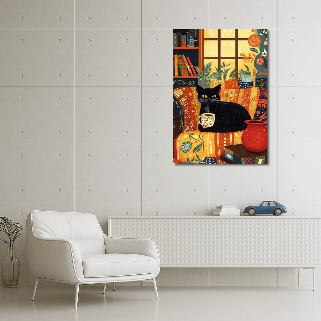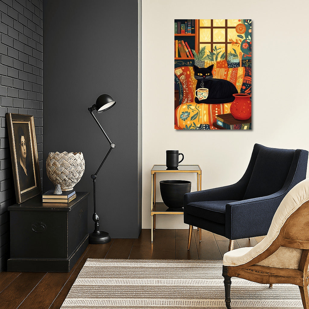 Black cat enjoys the comfort and aroma of tea. This poster will add warmth and coziness to your wall art. See more from the collection: Animals Art