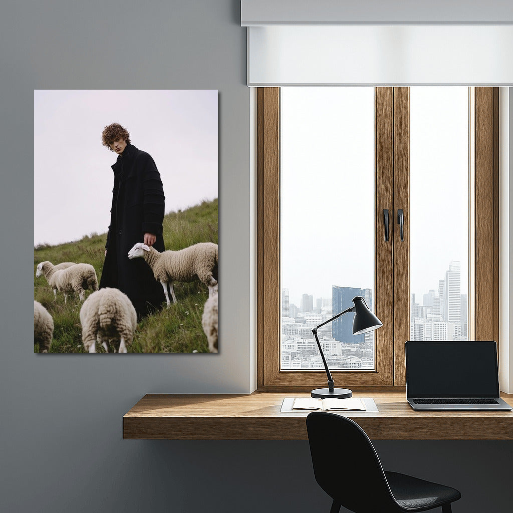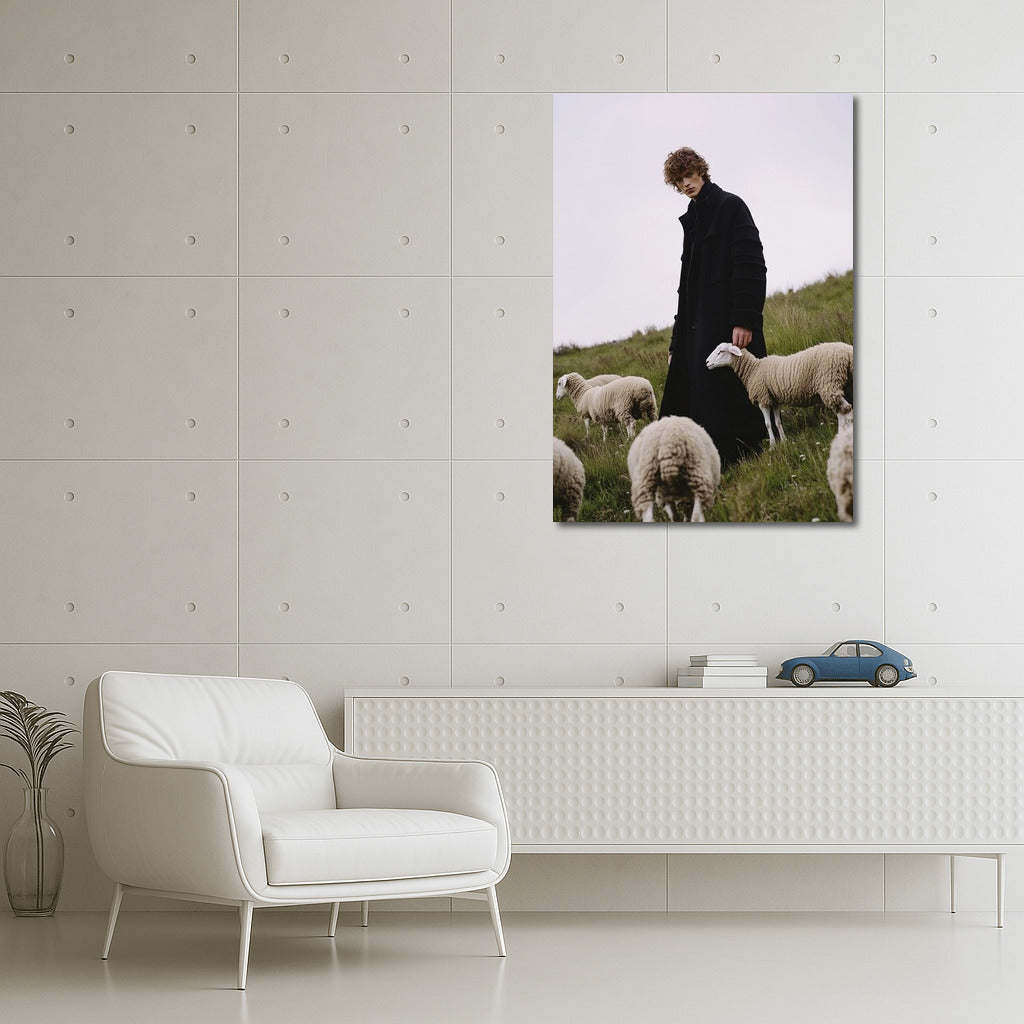 Fine wall art: a figure in black among sheep on a pastoral background. A fascinating combination of nature and style. See more from the collection: Mixed Wall Art