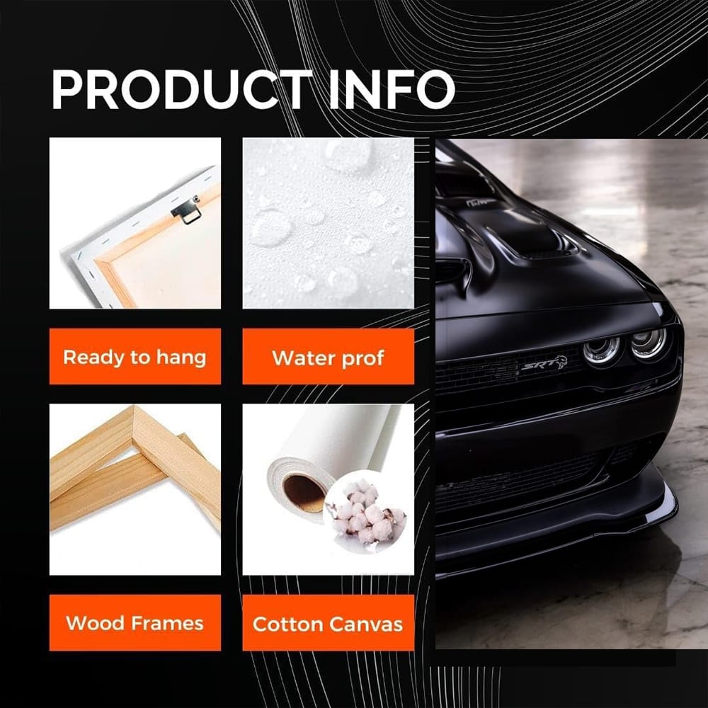 This poster is like an adrenaline shot for muscle car fans. The black marble Dodge Challenger on the wall is a real bomb! Wall art that will give you goosebumps. A painting that says: "I am here to rule the roads." See more from the collection: Dodge Art