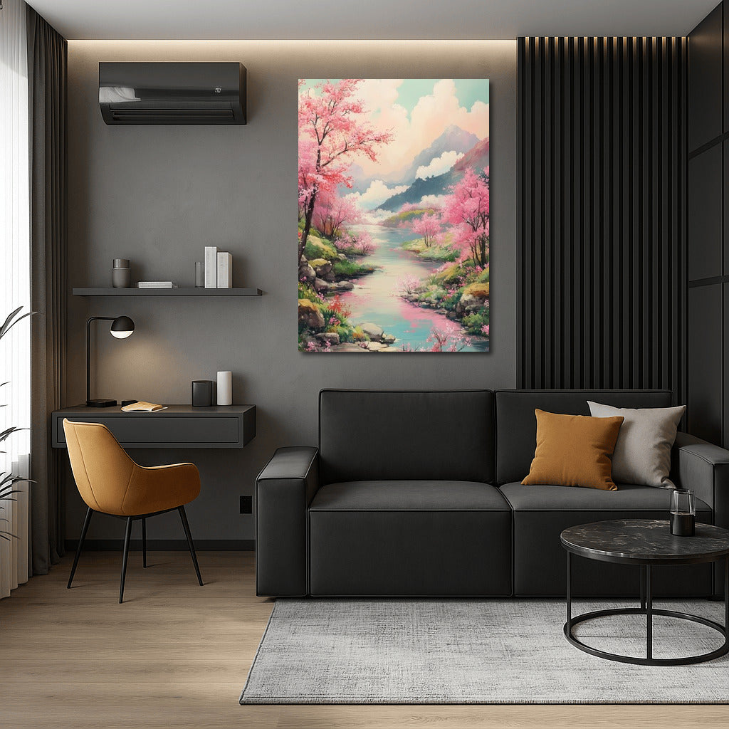 Spring in Colors: A magical poster with blossoming trees and a mountain landscape. Add the freshness of nature to your wall art! See more from the collection: Cherry Blossoms Art