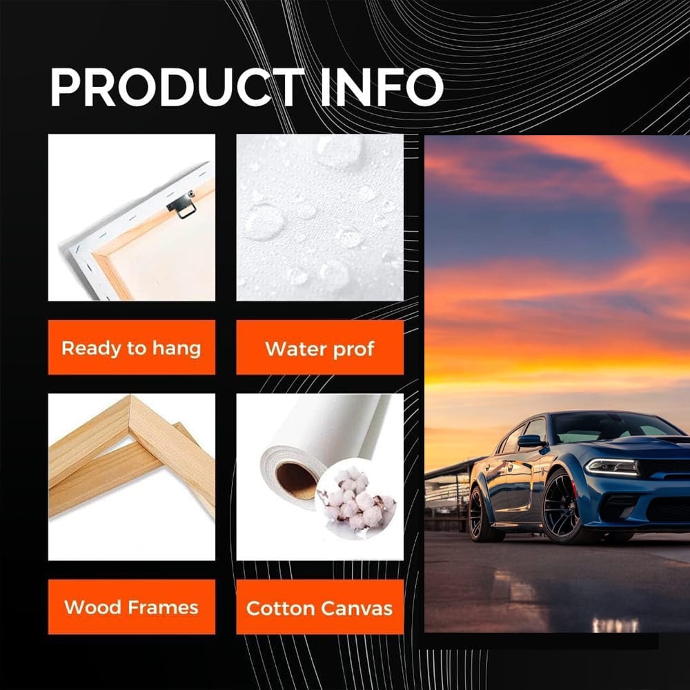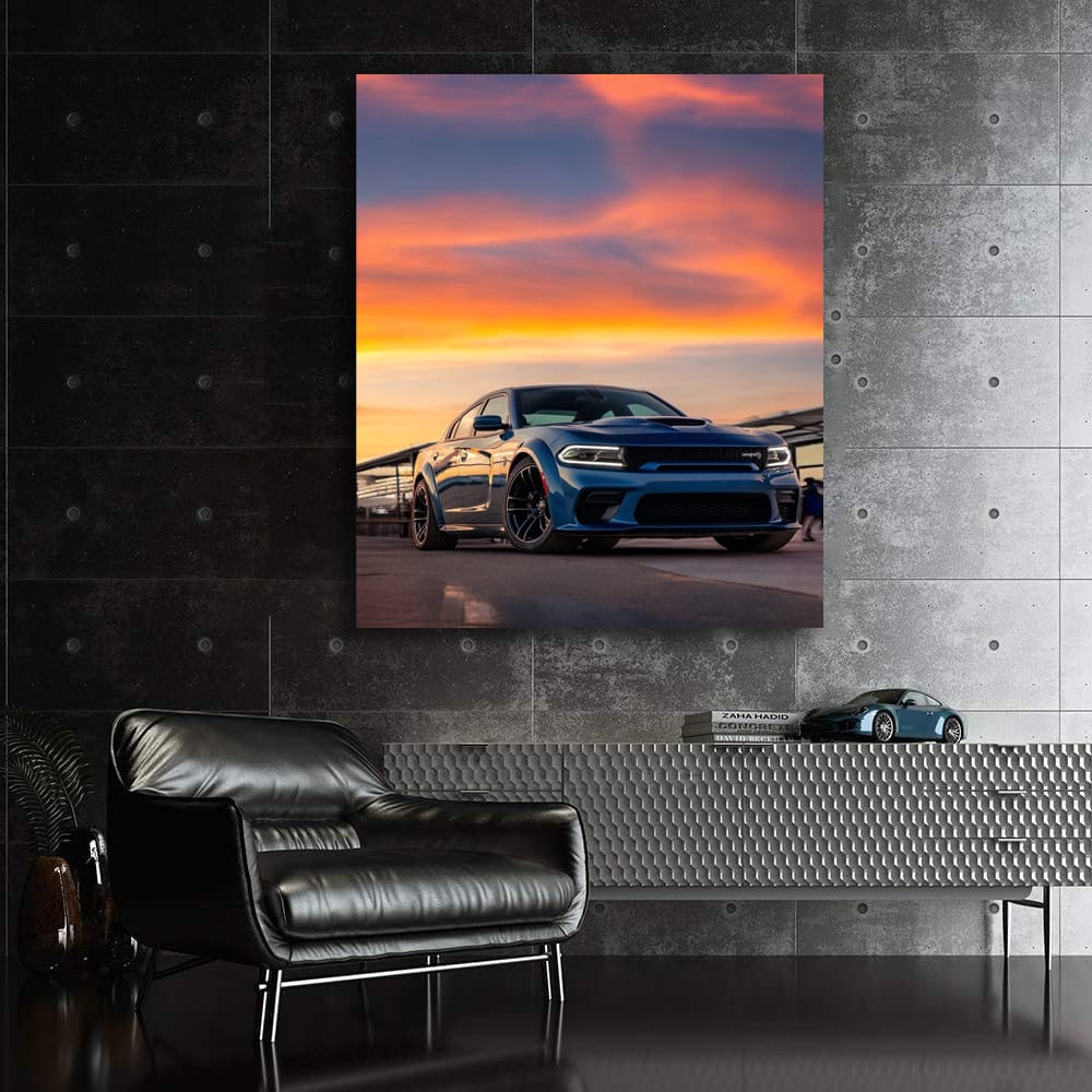 This poster is pure adrenaline for car lovers. The Dodge sunset painting is wall art that will make your heart beat faster. It is not just an image, but a challenge of speed and power that should be hanging on the wall of every car culture fan. See more from the collection: Dodge Art