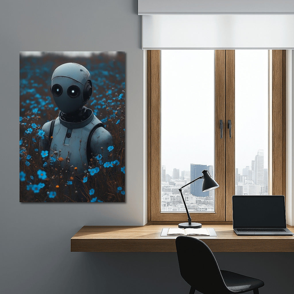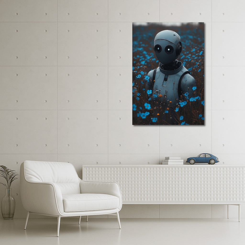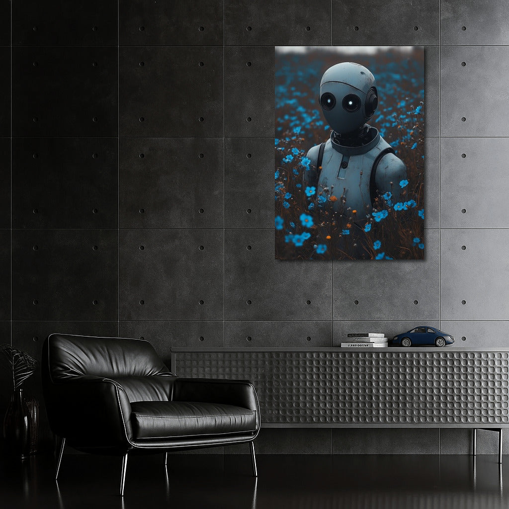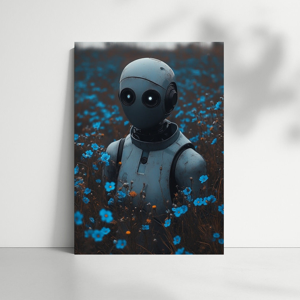 Robot and Blue Flowers: Futuristic Poster for Your Home. Wall Art That Combines Nature and Technology. See more from the collection: Mixed Wall Art