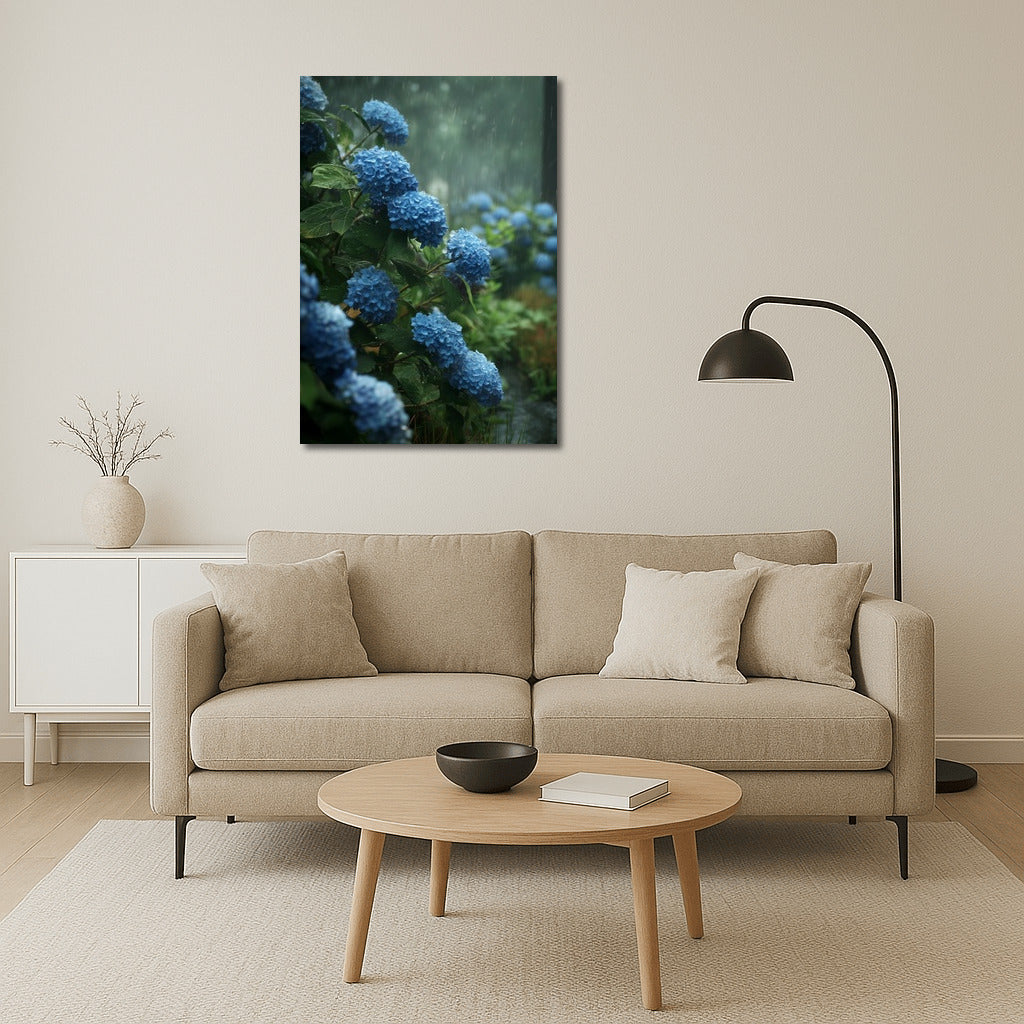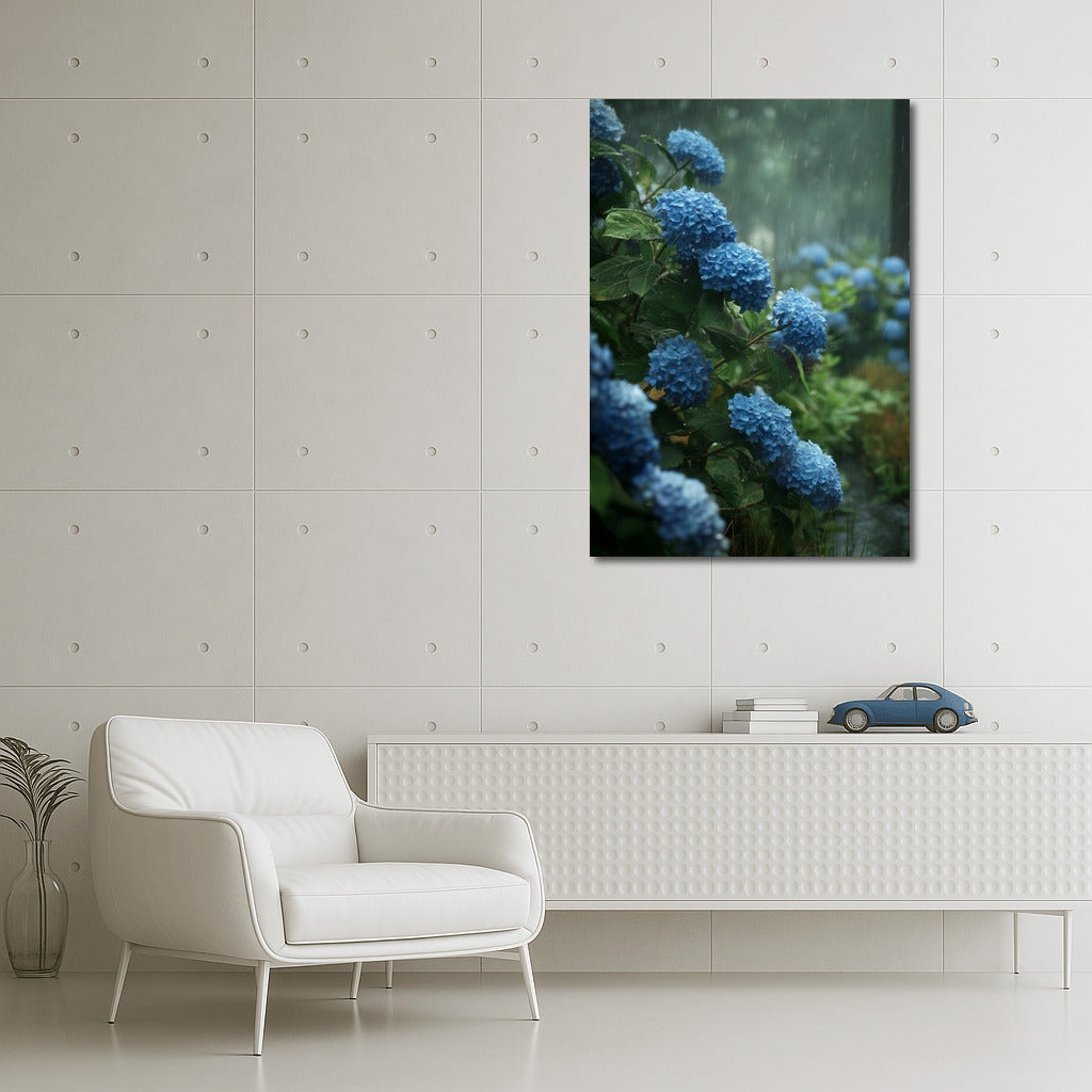 Blue Hydrangeas: Floral Symphony in the Rain Wall Art