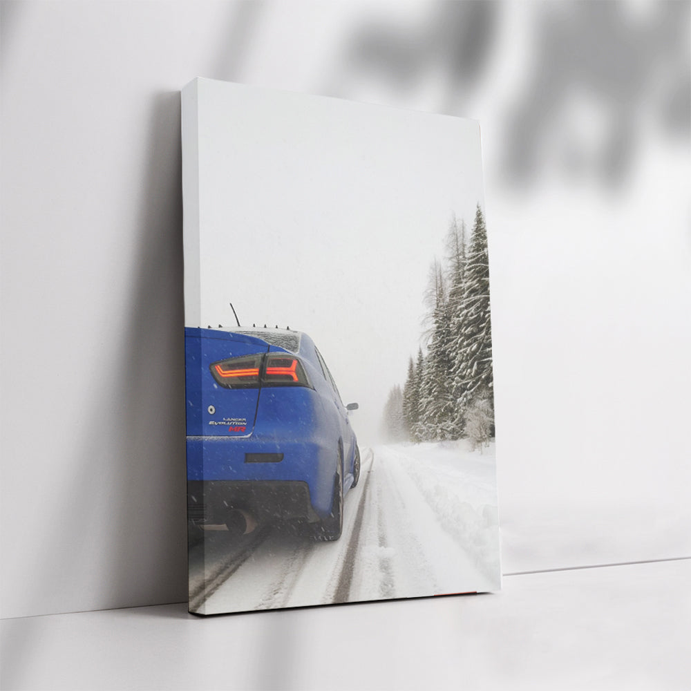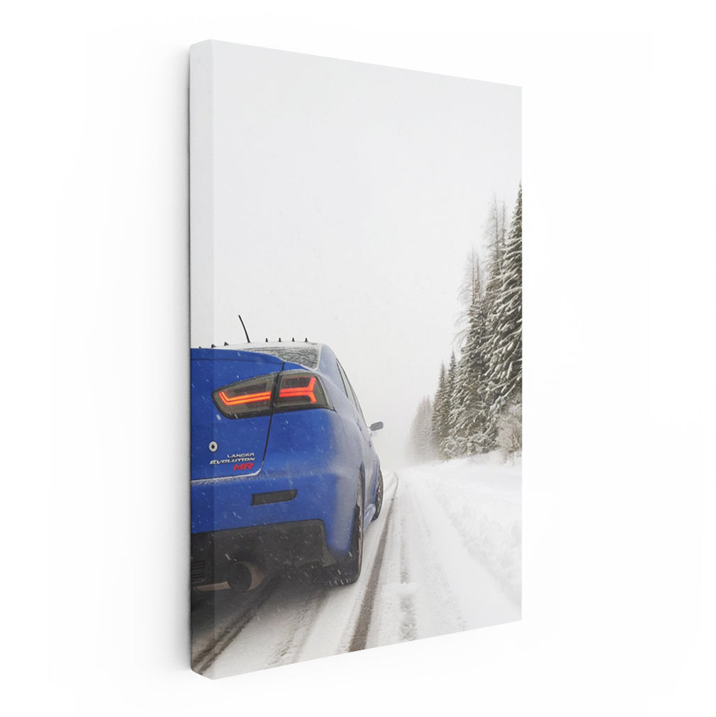 Blue Mitsubishi Lancer in Snow - Adventure Awaits Wall Art