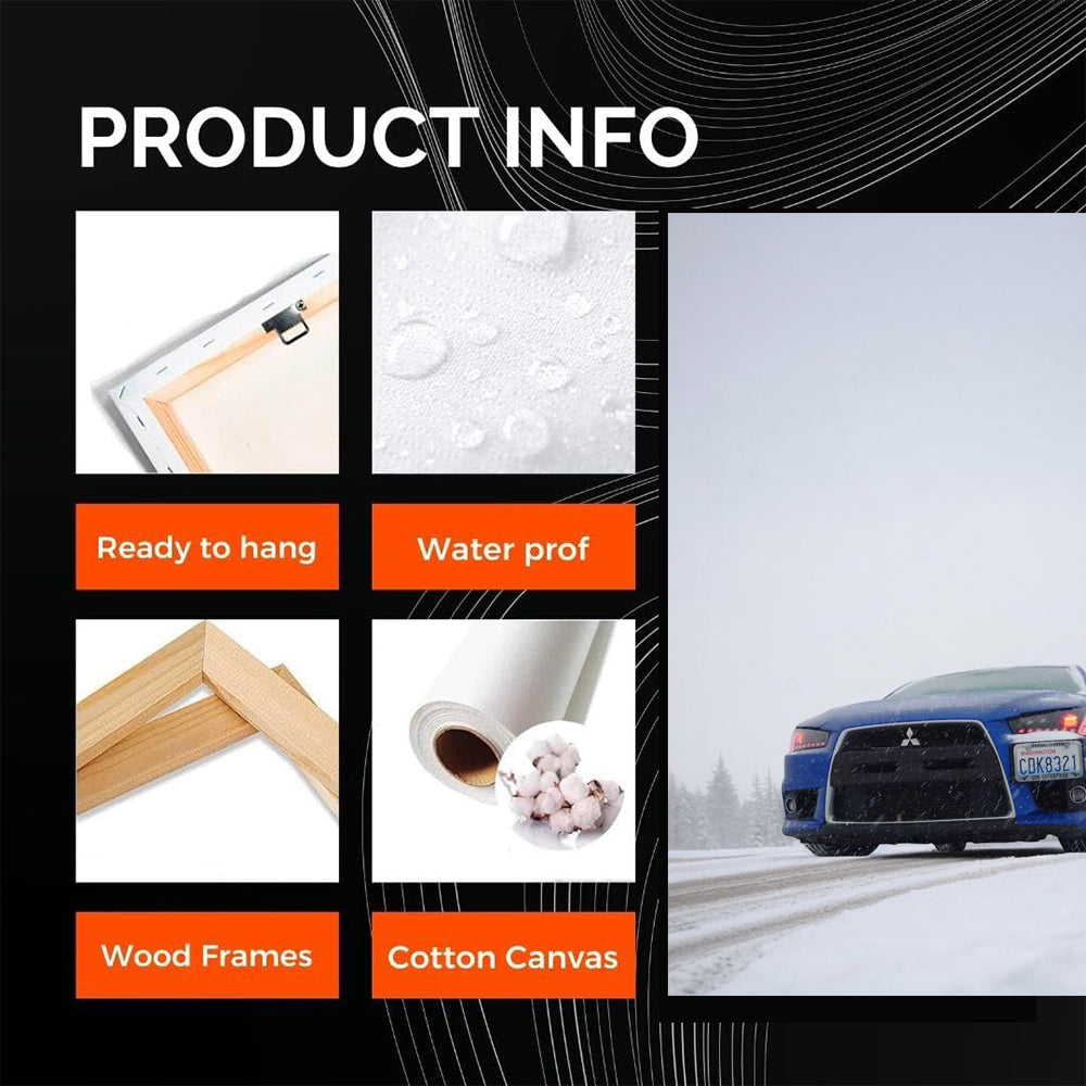 What a poster! A blue Mitsubishi Lancer, like from a snowy fairy tale, bursts into your room. This is wall art for true connoisseurs of speed and drive. A painting that makes your heart beat faster. Just like your car after tuning! See more from the collection: Mitsubishi Art