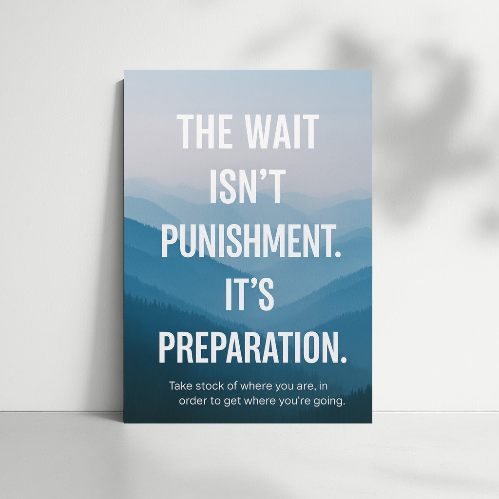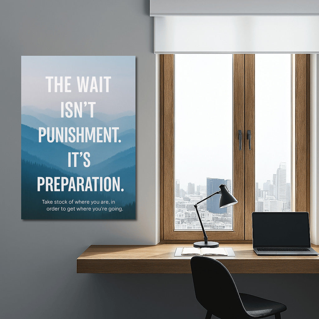 An immersive poster with blue mountains and fog will remind you: waiting is not a punishment, but a preparation. Wall art for growth. See more from the collection: Dreams & Vision Quotes Art