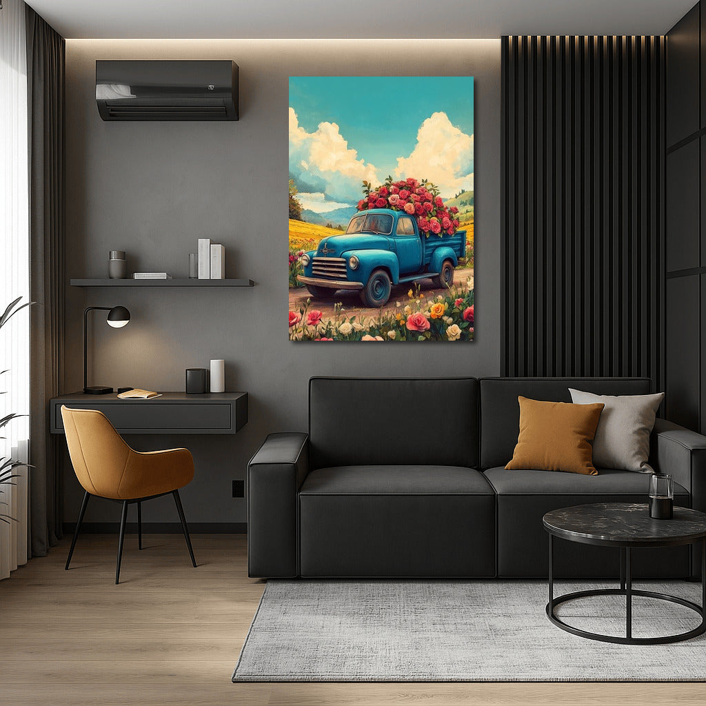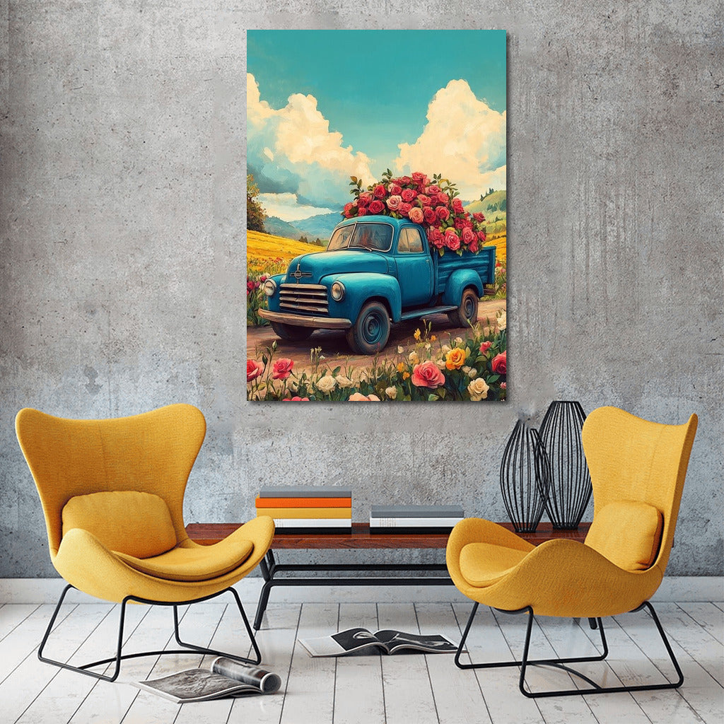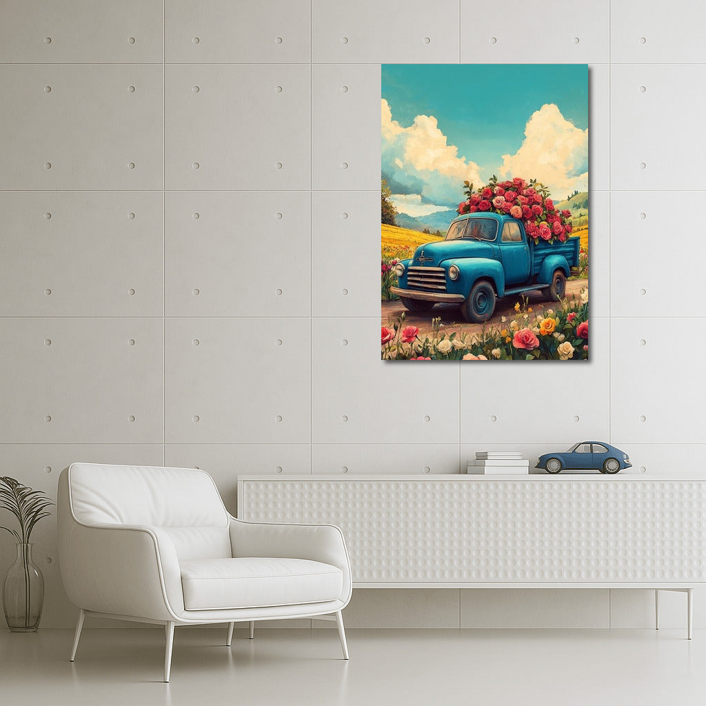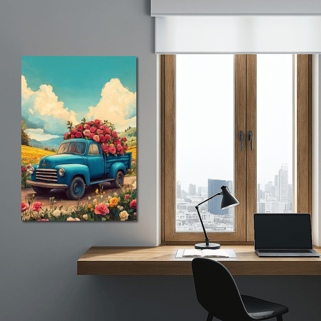 Dive into a floral dream with this poster: a vintage blue Chevrolet pickup truck surrounded by roses and endless fields and clouds. See more from the collection: Mixed Wall Art