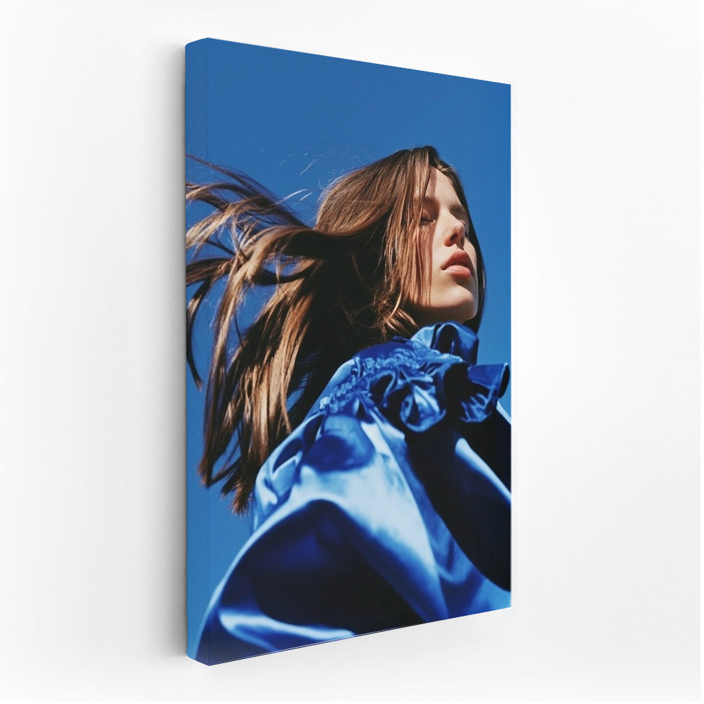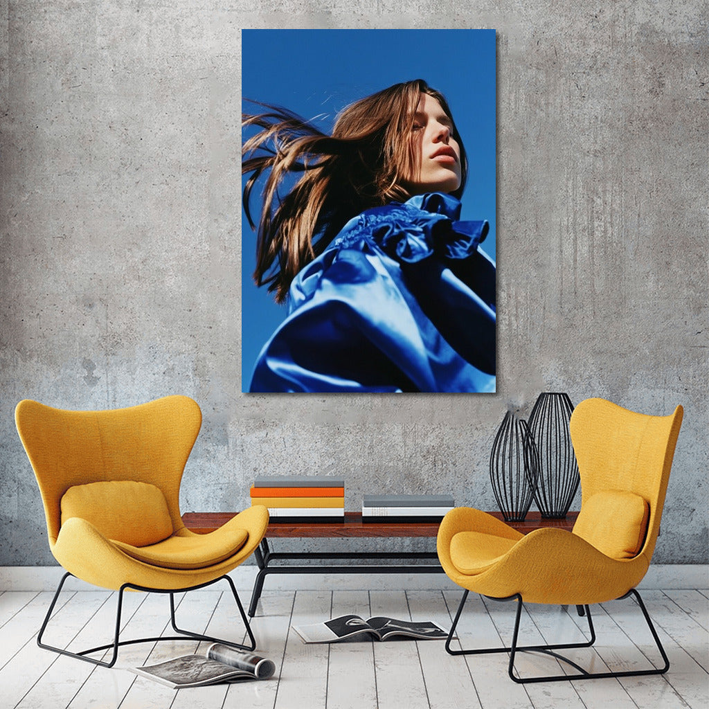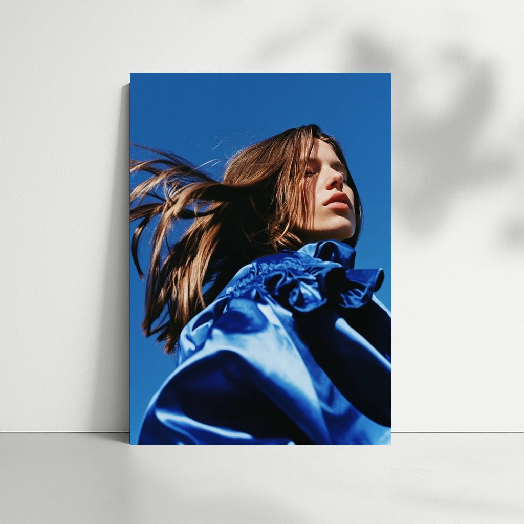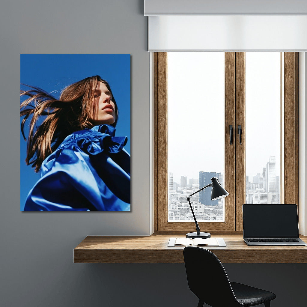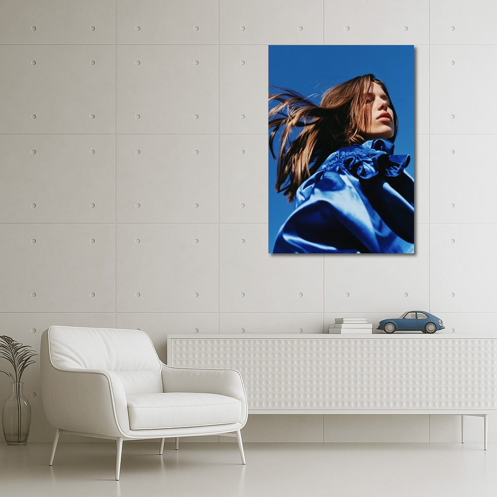 Poster Under the Breeze: a gentle silhouette in blue against a cloudless sky. Wall art filled with freedom and freshness. See more from the collection: Wall Art with Women
