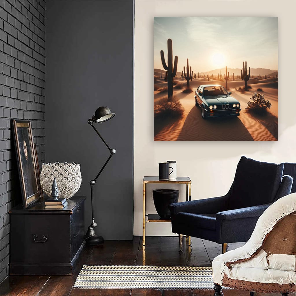 Here it is, the legend of the road - BMW E30, embodied in a cool poster. This painting is destined to become the star of your wall art collection. The desert background adds drama, and the aggressive style of the car fans screams speed and freedom. This is not just a poster, it is a challenge! See more from the collection: BMW 3 Series Art