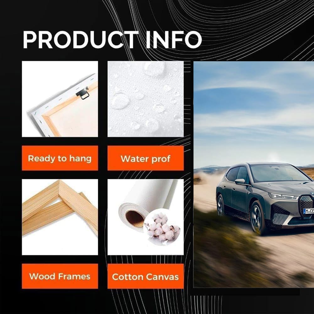 This painting is pure adrenaline on the wall! BMW iX M60 is like a cool poster on the wall of the garage where real car fans gather. This wall beauty screams about speed and power, as if roaring on the track, and adds a stylish touch to any man's corner. See more from the collection: BMW Art