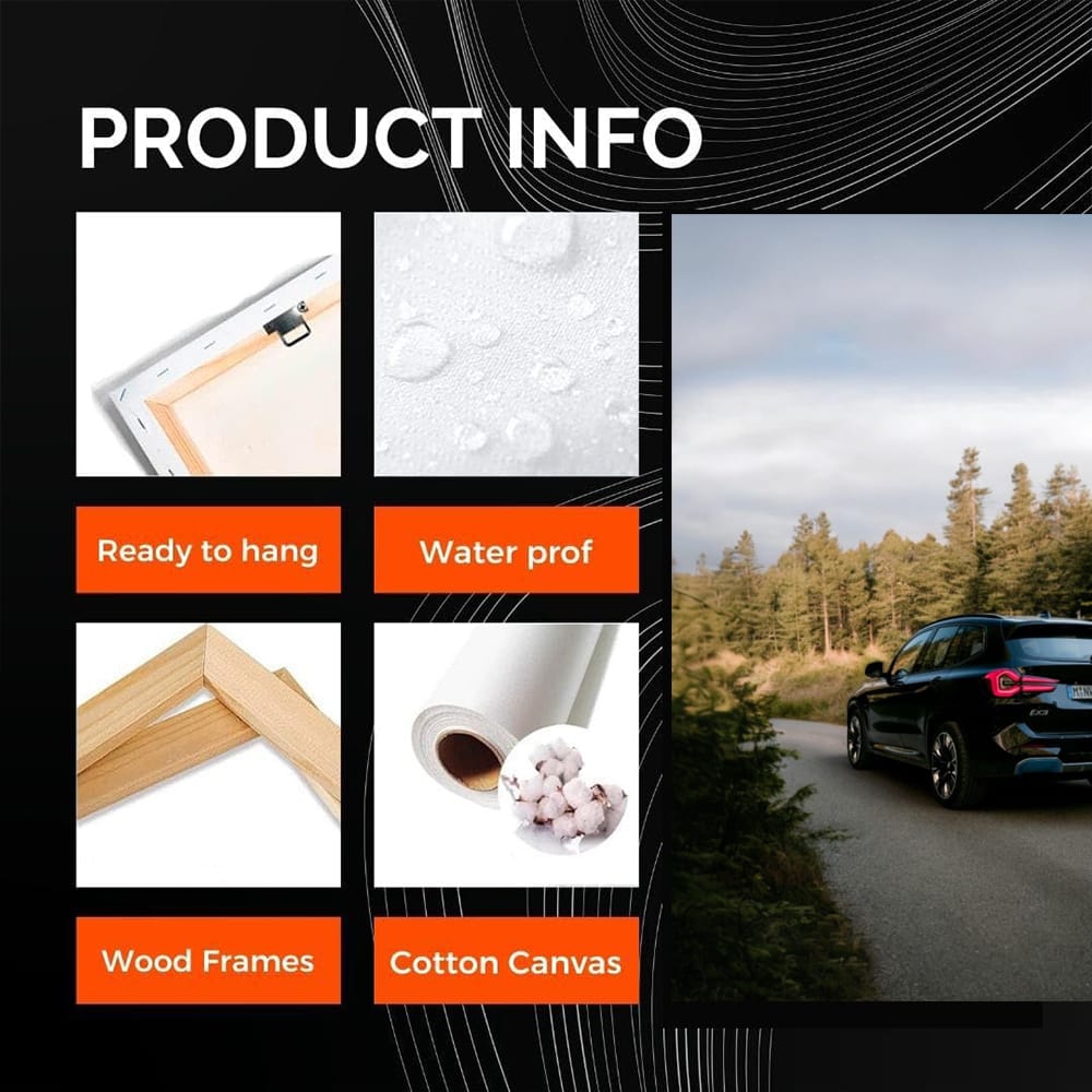 Dude, this poster of the BMW iX3 in black is a blast! Wall art that will give you goosebumps. This painting charges like a turbine at full speed. If you are a fan of cars, this is definitely what your lair needs. See more from the collection: BMW Art