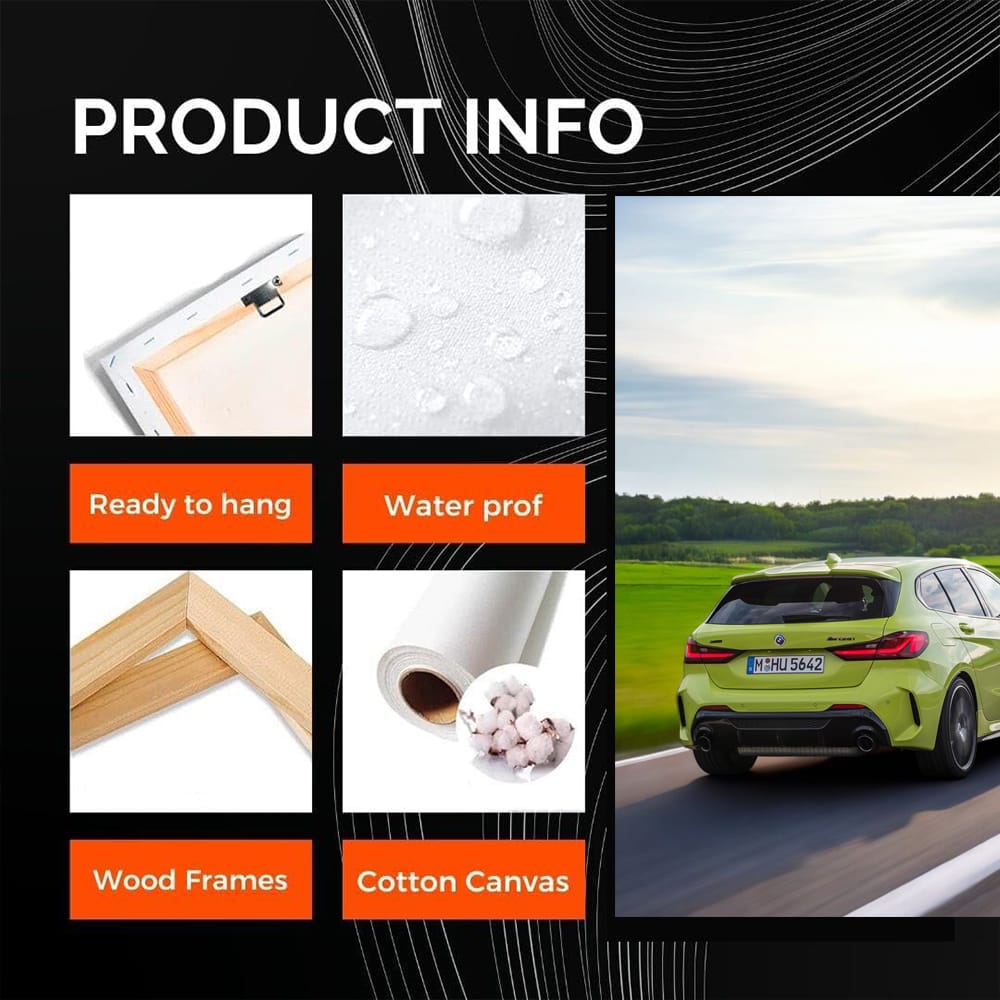 Hey car guy, check out this BMW M135 poster in screaming yellow! Wall art that will give you goosebumps. This painting is pure speed and adrenaline on the wall. The perfect way to decorate your garage or just get inspired before your next road trip. See more from the collection: BMW 1 Series Art
