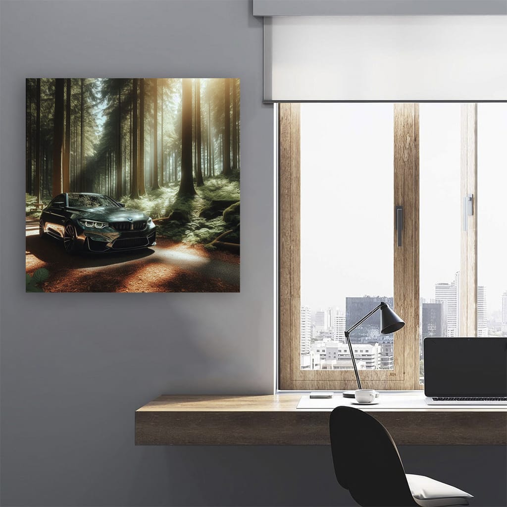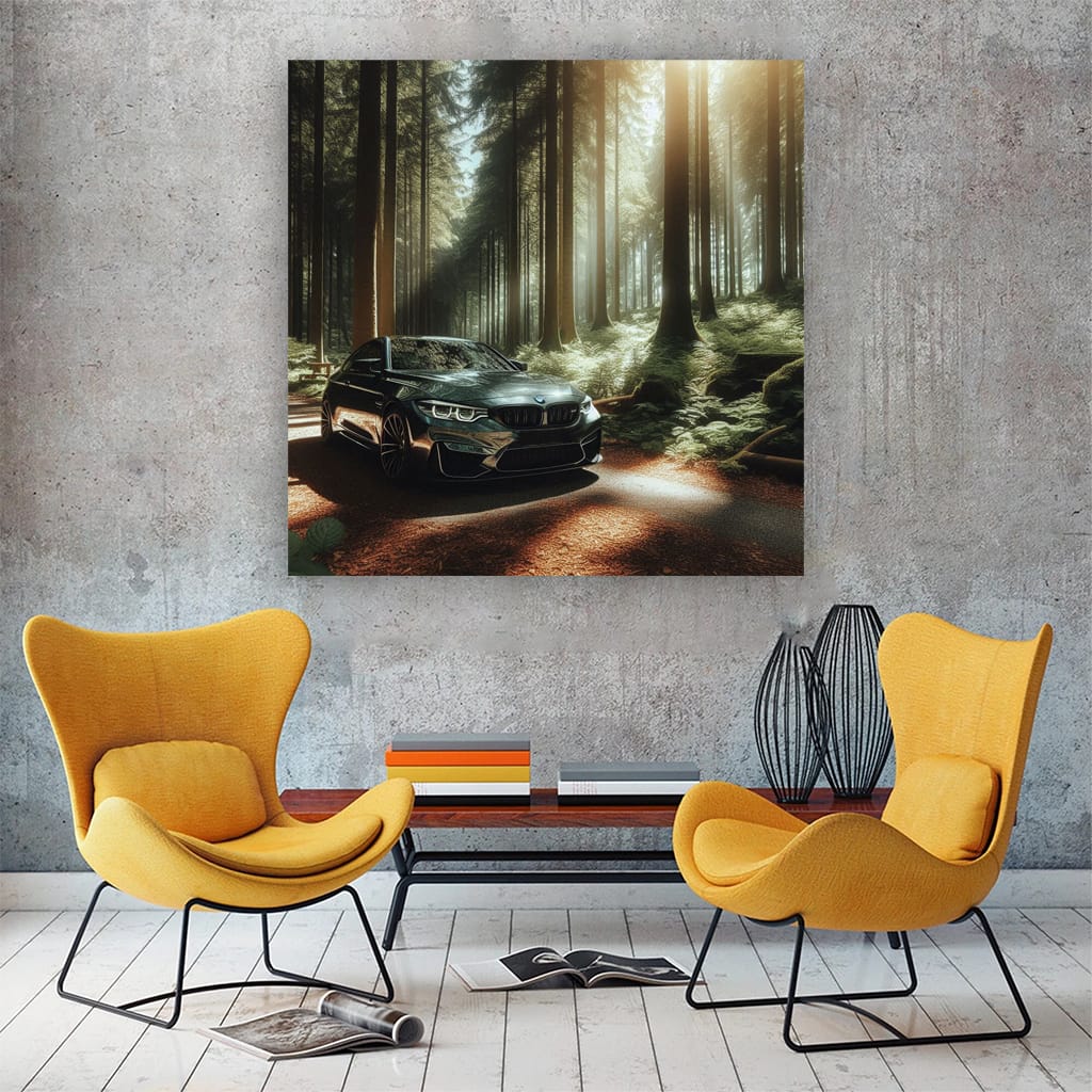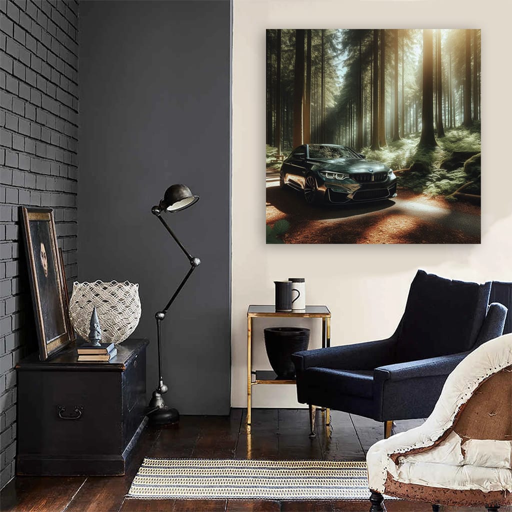 This painting is pure adrenaline! BMW M2 in the forest, like an animal on the hunt. This poster is a perfect piece of wall art for a real car enthusiast's garage. It is charged with power and speed, like your favorite car on the track. A real must-have for BMW fans! See more from the collection: BMW 2 Series Art
