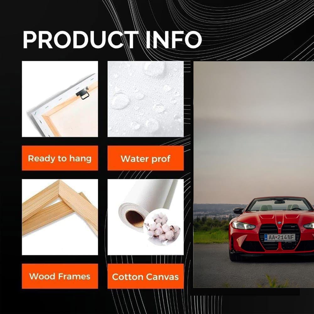 This poster is an art bomb! The painting with the front view of the 2025 BMW M4 Competition in a bright red convertible is wall art for real car fans. Power and style ooze from every inch, making you want to break away and start drifting. See more from the collection: BMW 4 Series Art