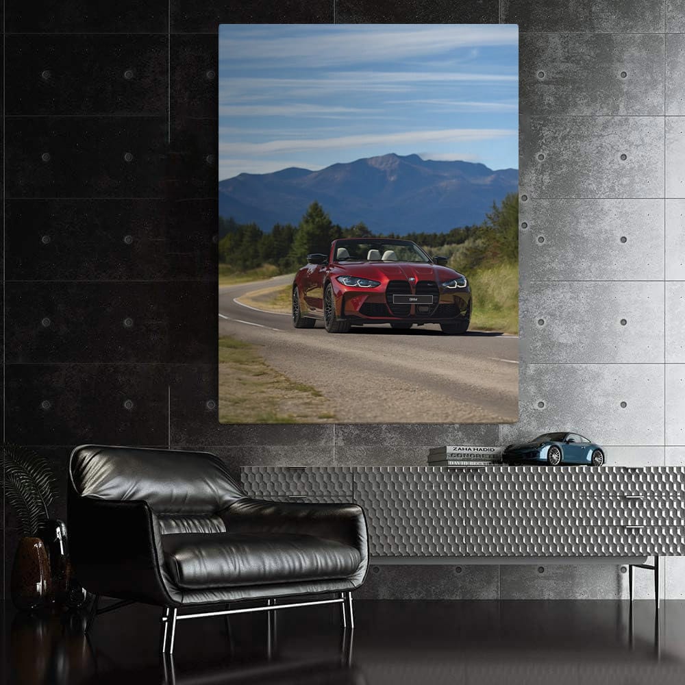 This poster is a blast! There's a painting of the BMW M4 Competition Convertible hanging on the wall, and you can immediately feel the power and style of this beast being conveyed through the wall art. This is for those who understand real cars. See more from the collection: BMW 4 Series Art