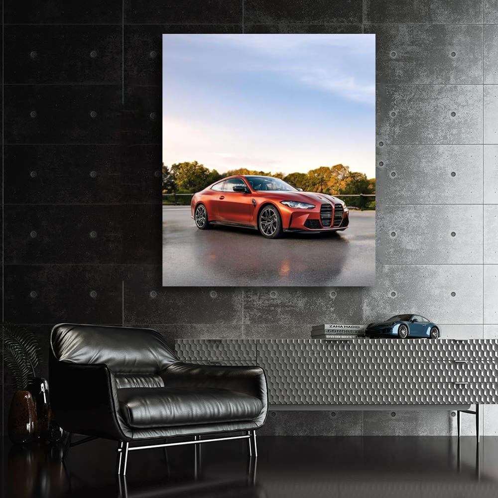 Bro, painting this: a poster of a gold and orange BMW M4 G82 glittering against the backdrop of nature hanging on the wall. This painting is like a symbol of speed and daring. Wall art that makes you want to get behind the wheel and put the pedal to the metal. See more from the collection: BMW 4 Series Art