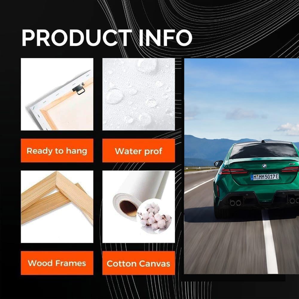 This car on the wall is like an adrenaline rush. The poster with the BMW M5 is a beast in iron, ready to tear up the asphalt. The painting takes your breath away, you can immediately see that this is wall art for those who are in the know. Every detail says: "I am the king of the road." See more from the collection: BMW 5 Series Art