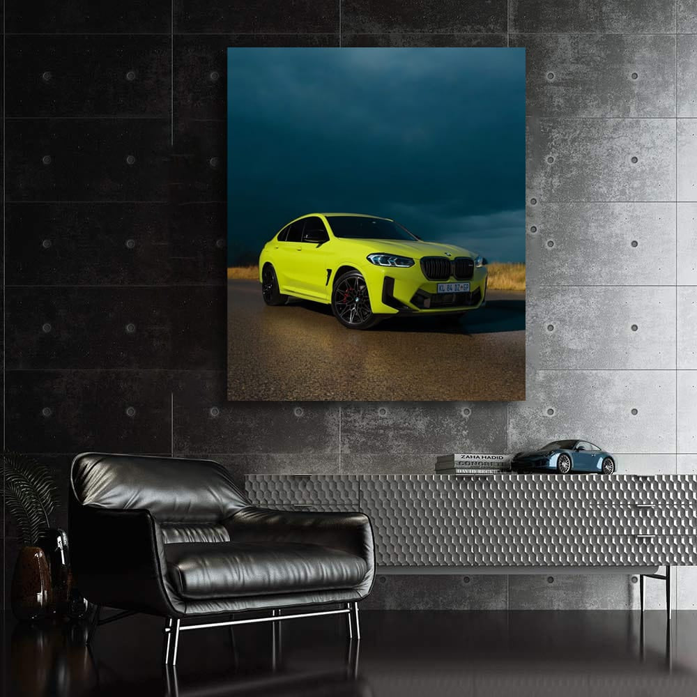 Dude, this lemon colored BMW X4 M wall art is just fire! The poster screams speed and adrenaline, like a real beast on the road. This painting is a car lover's dream, it will instantly liven up your room and give it a bold style. See more from the collection: BMW Art