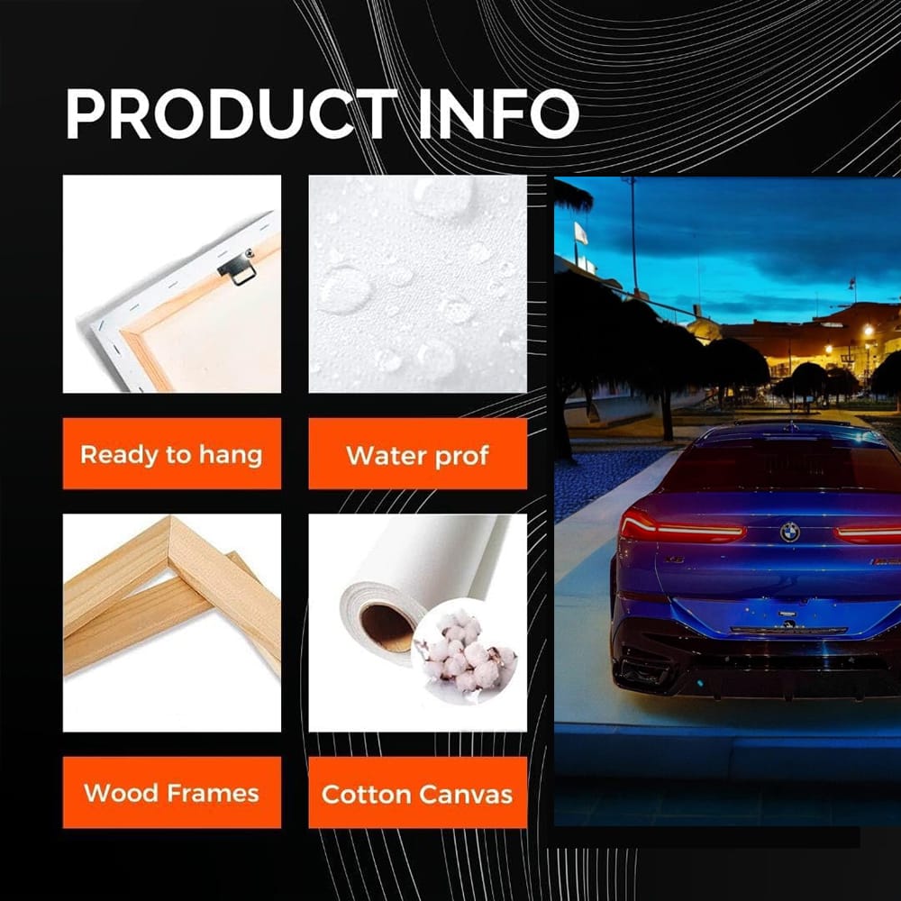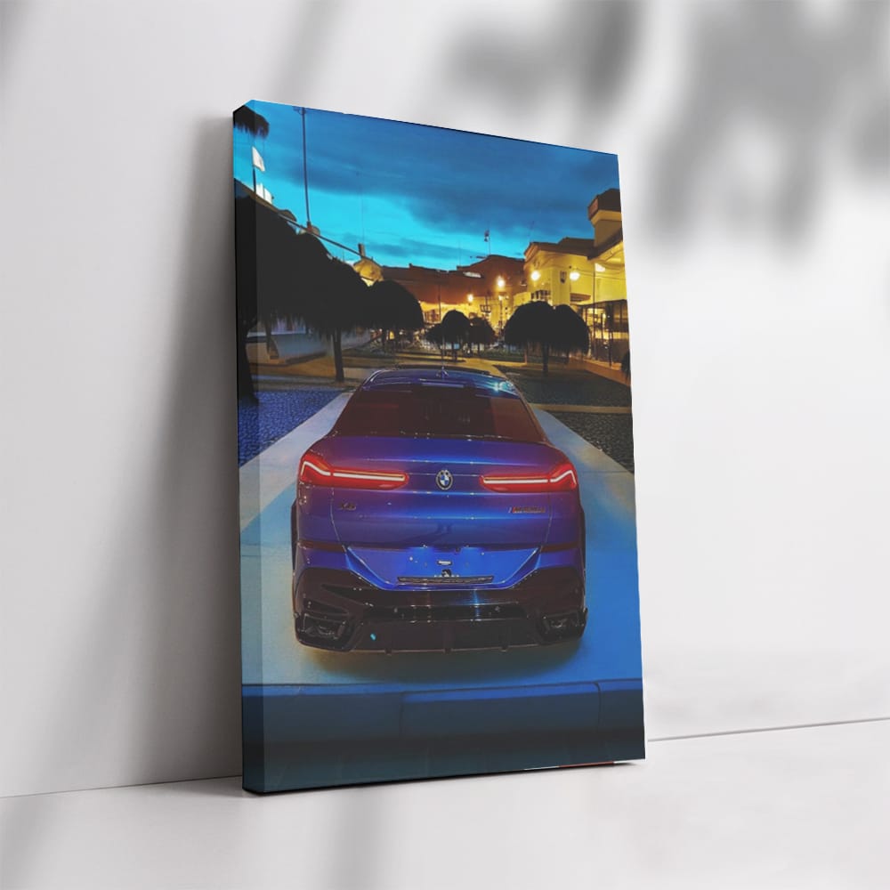 This poster is the bomb! The dark blue BMW X6M in the painting is not just a car, but a beast on the night road. Wall art that will pump up any garage or man cave. Just a thrill for those who are in the know and appreciate power and style. See more from the collection: BMW Art
