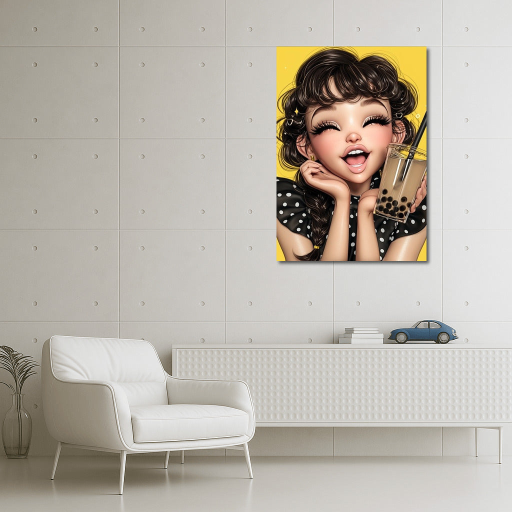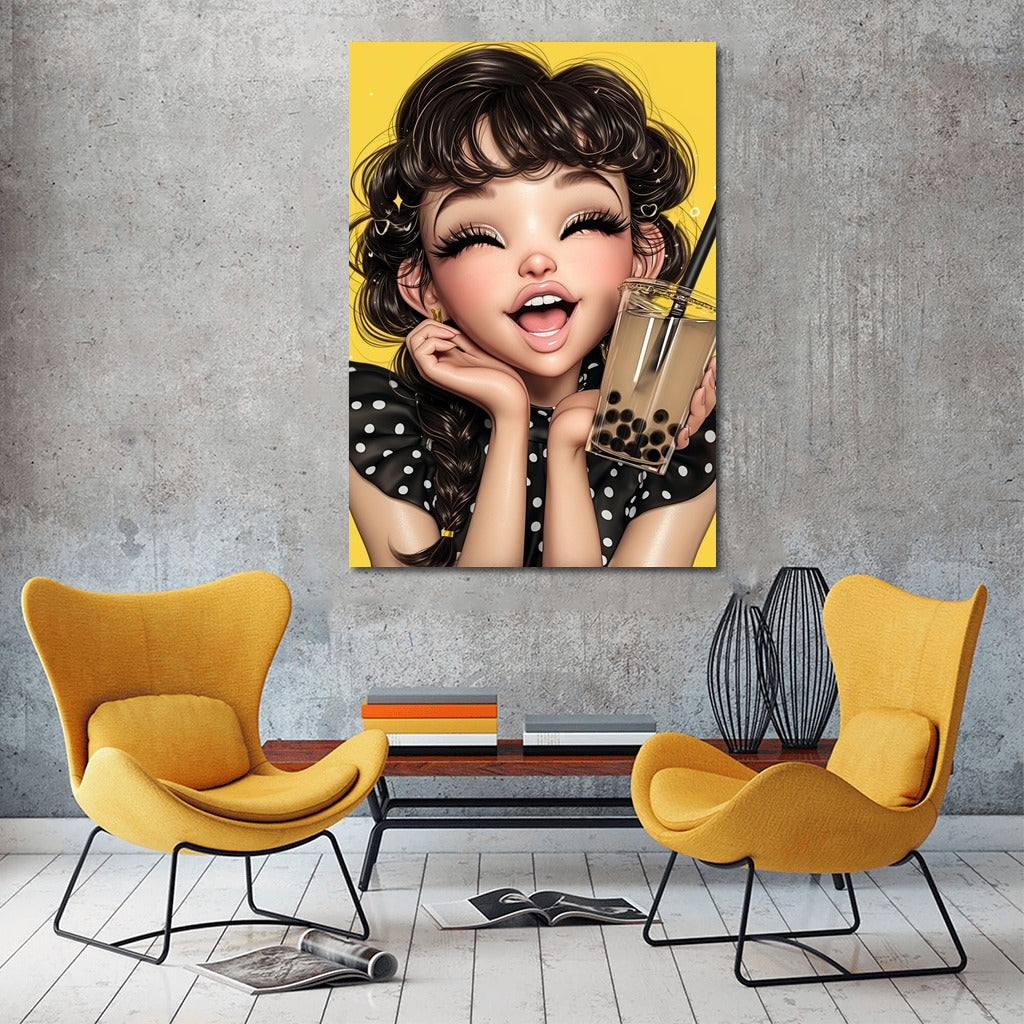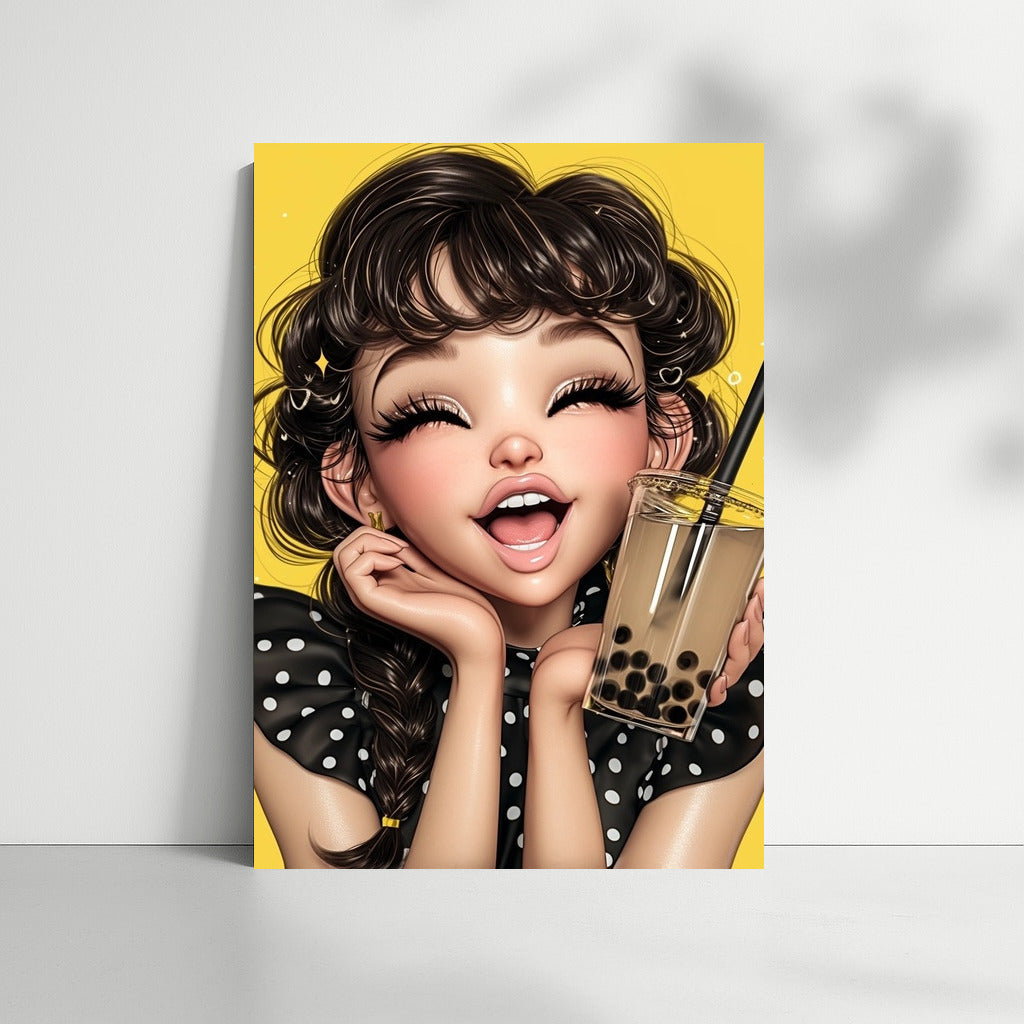 Adorable girl with boba tea on a bright background. This poster will add freshness and playfulness to your wall art! ? See more from the collection: Pop Art