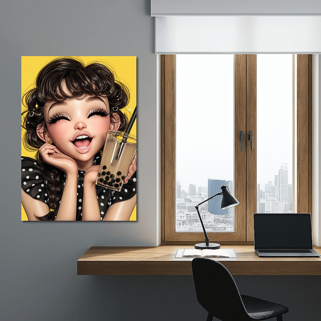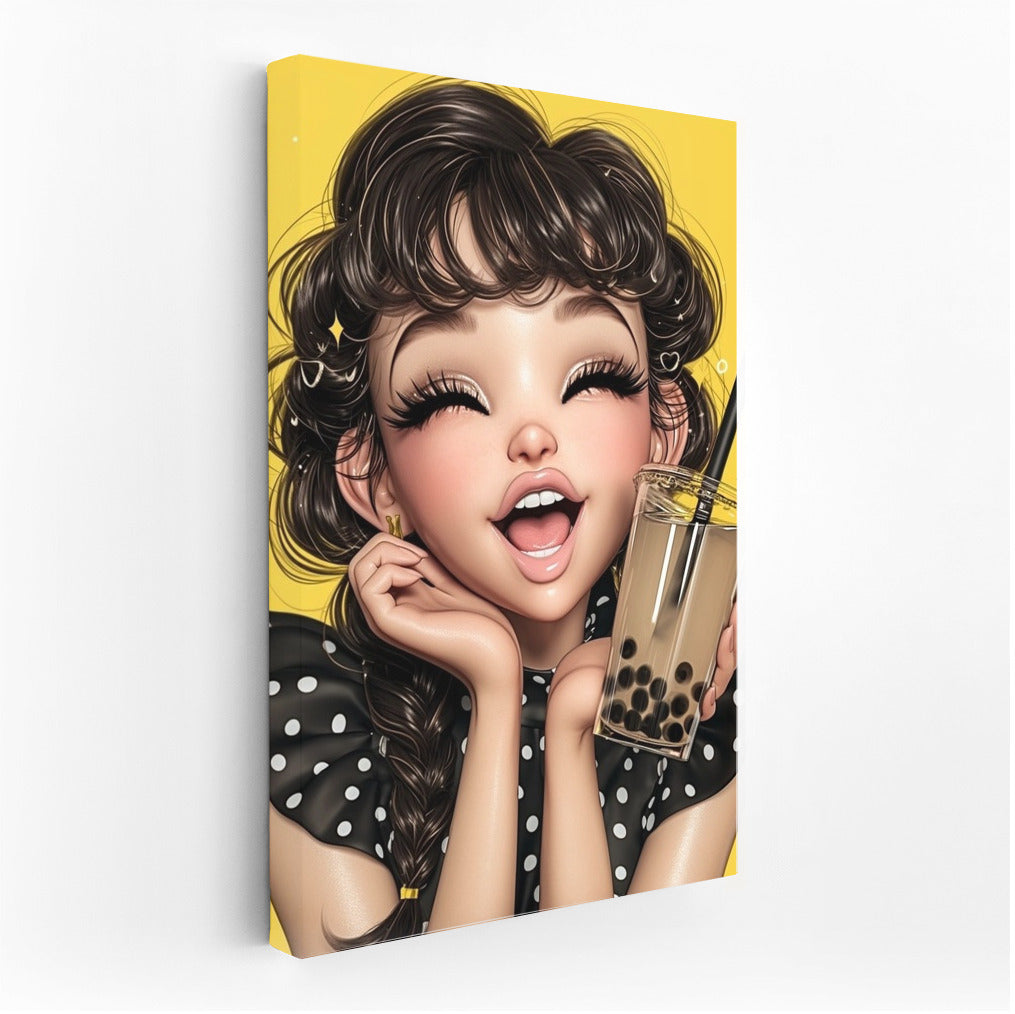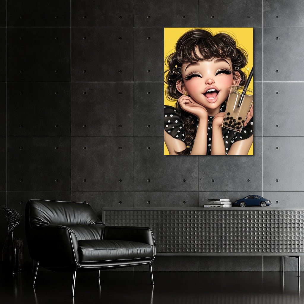 Adorable girl with boba tea on a bright background. This poster will add freshness and playfulness to your wall art! ? See more from the collection: Pop Art