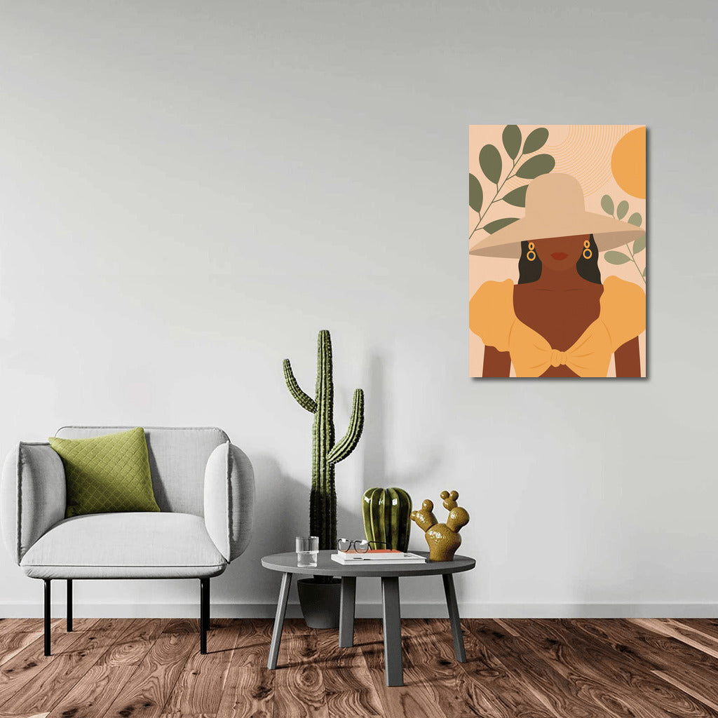 An elegant boho mystery: a woman in a hat among leaves and sun. Wall art filled with warmth and harmony. See more from the collection: Boho / Bohemian Style Art