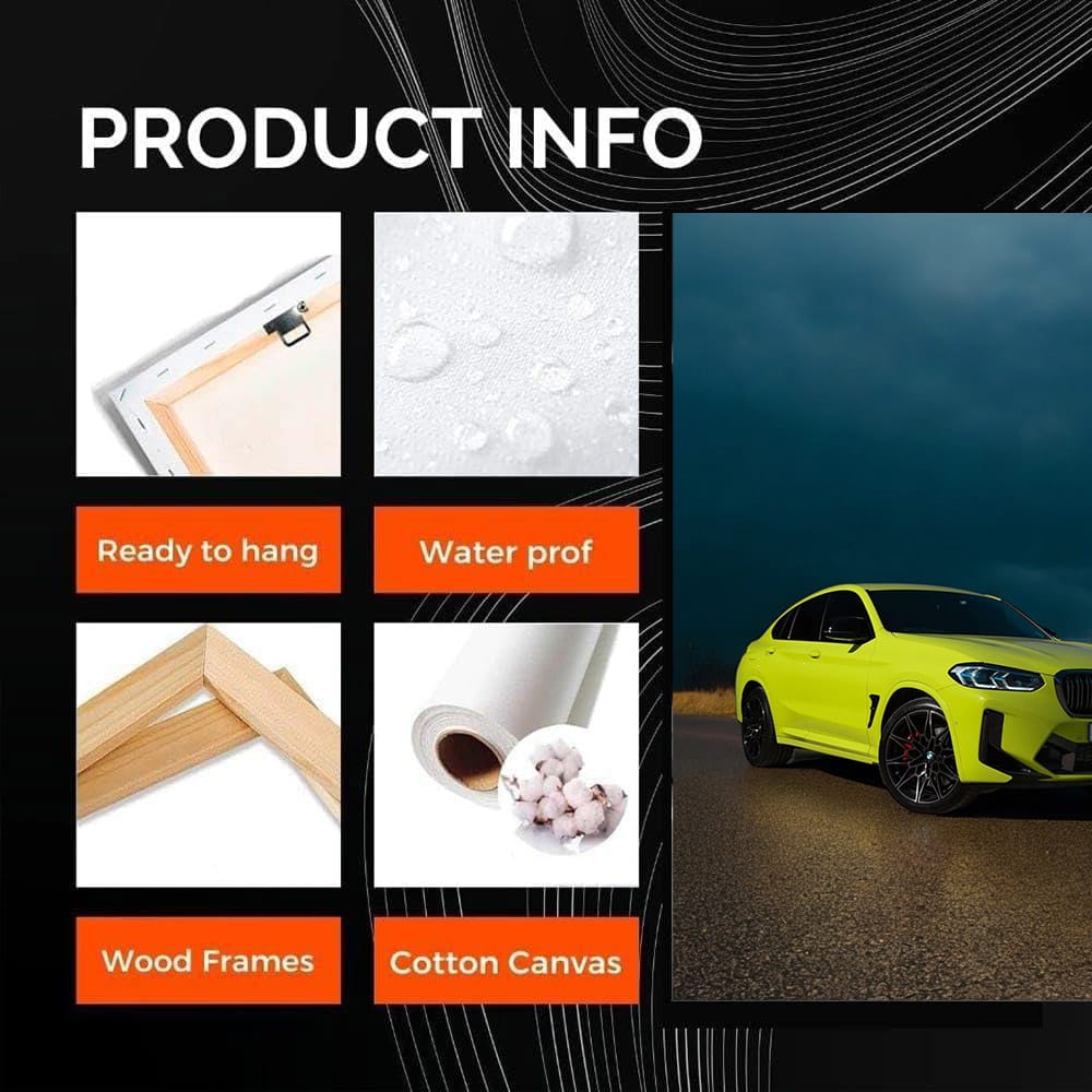 Hey bro, check out this poster of a BMW X4 M in bright yellow! Wall art for true car fans. This painting screams adrenaline and speed. Every time you pass by, it whispers: "Come on, step on the gas!" See more from the collection: BMW Art