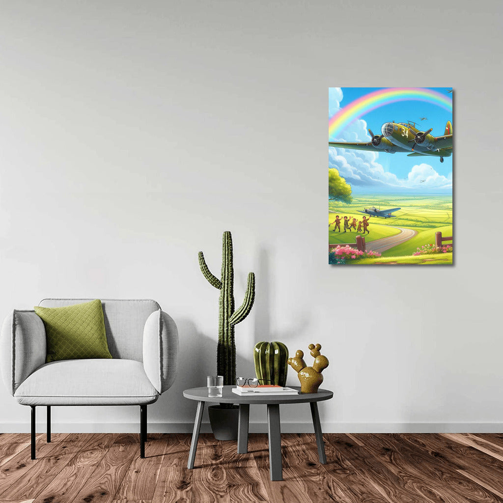 A poster of a bomber flying under a rainbow. Wall art where dreams soar in skies filled with magic. See more from the collection: Military & Veterans Art