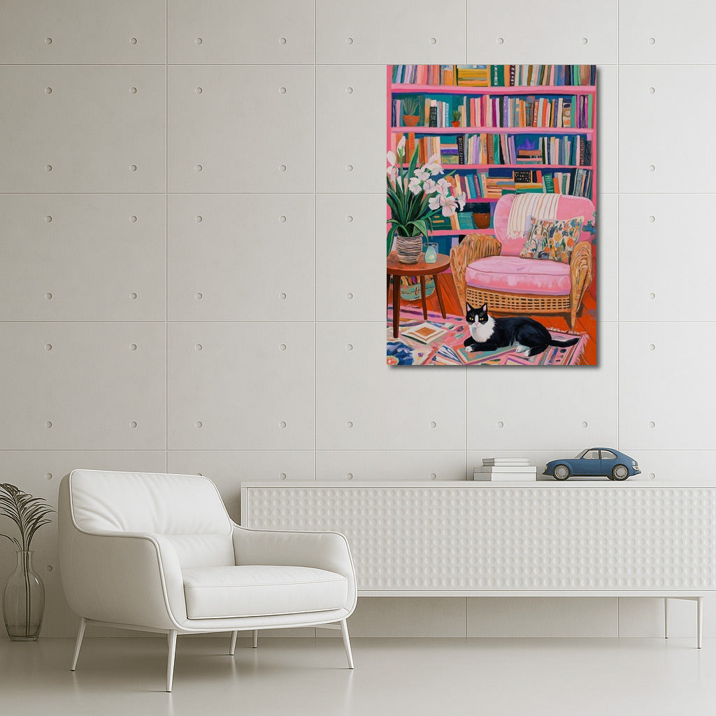 Cozy wall art: colorful books, a wicker chair and a cat create an atmosphere of home comfort and inspiration. See more from the collection: Cozy Interiors Art