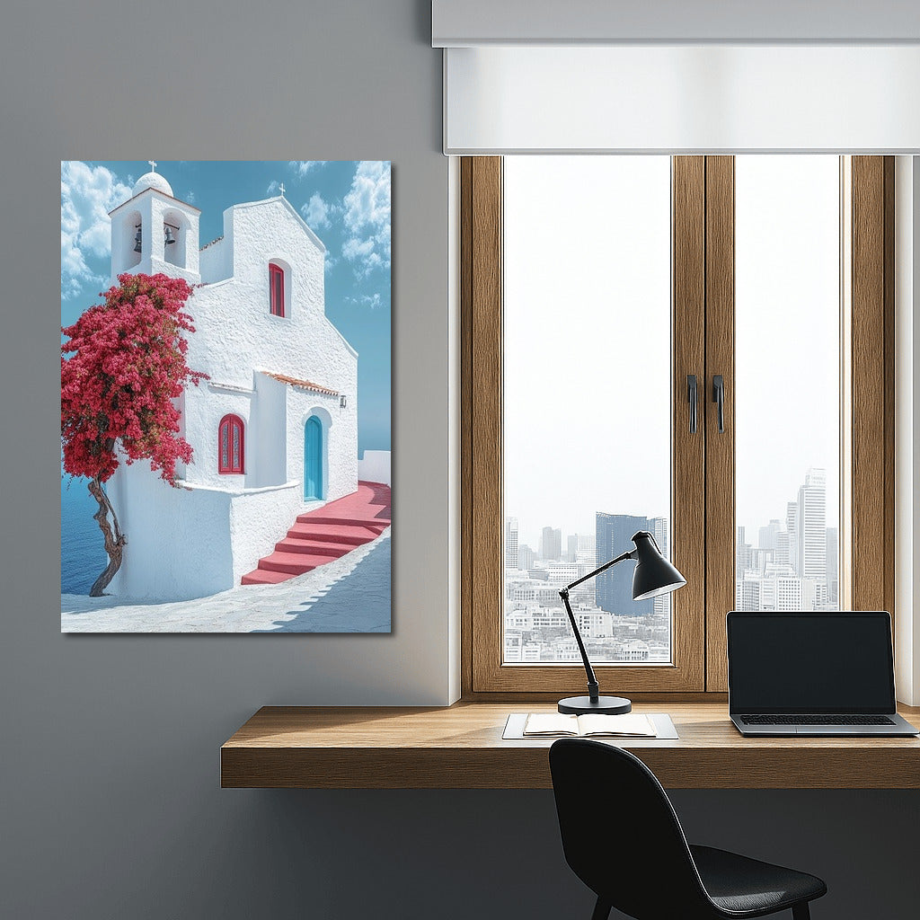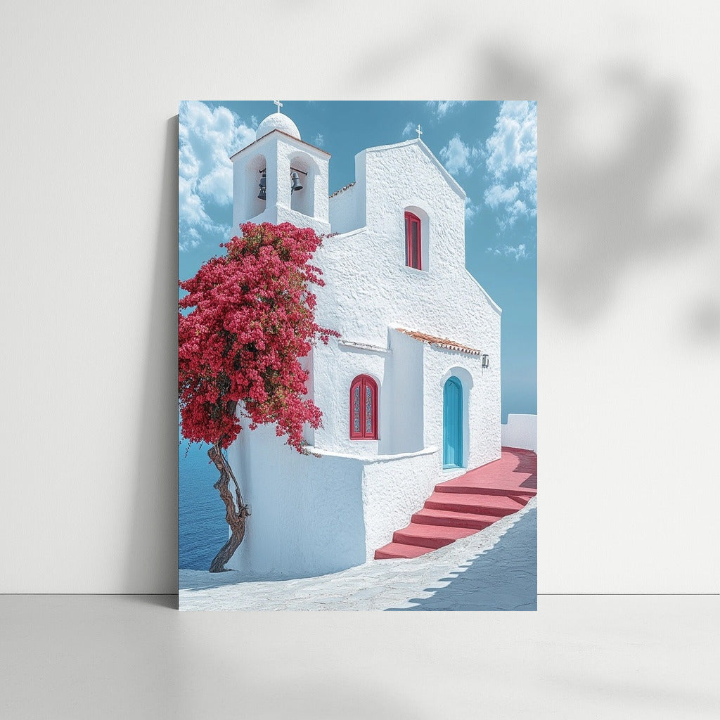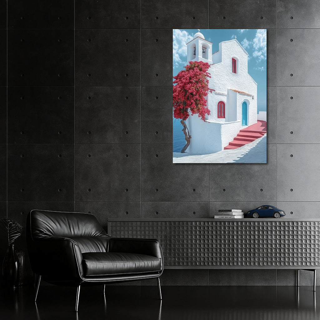 Mediterranean dream: a painting of silence and beauty, where snow-white walls and bright bougainvillea meet under the sky. Wall art. See more from the collection: Mixed Wall Art