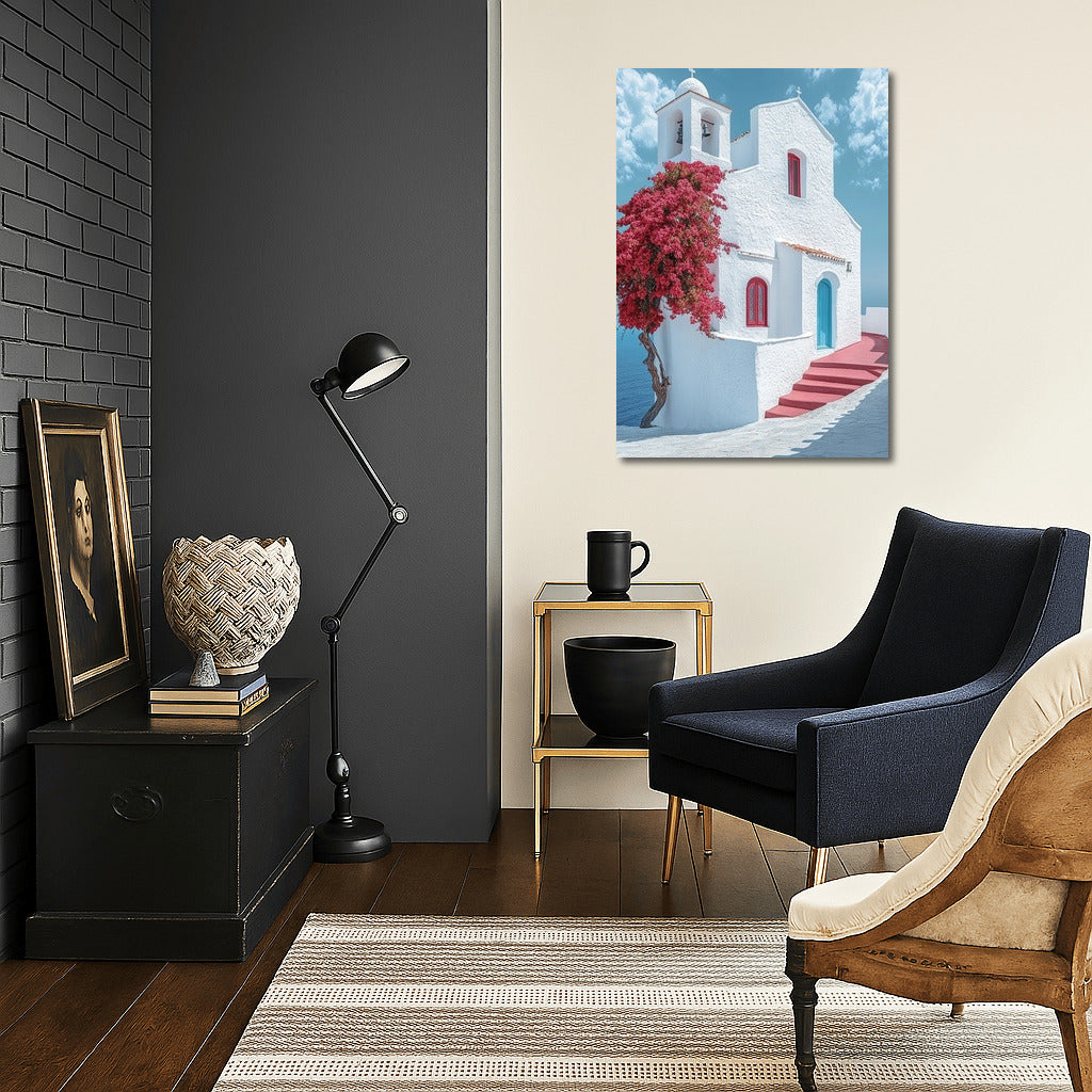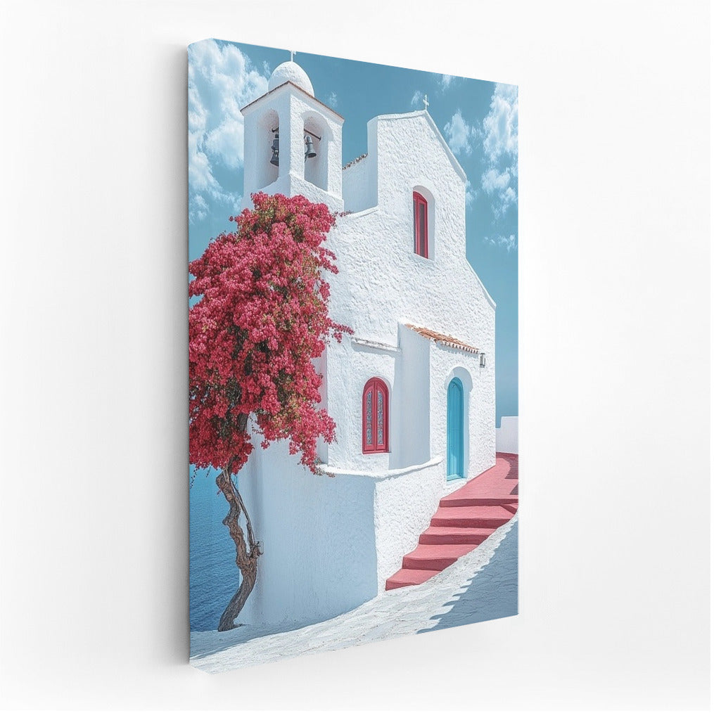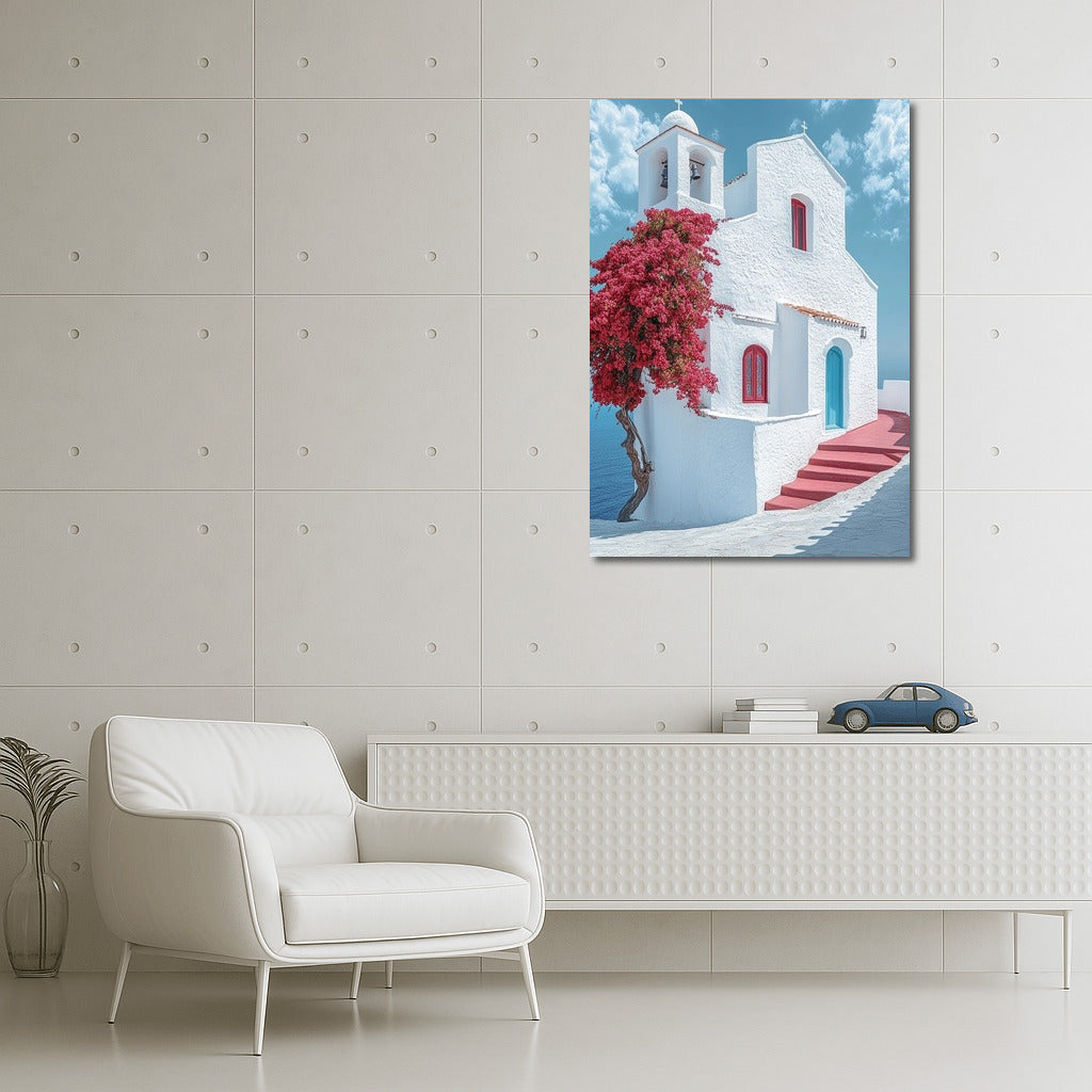 Mediterranean dream: a painting of silence and beauty, where snow-white walls and bright bougainvillea meet under the sky. Wall art. See more from the collection: Mixed Wall Art