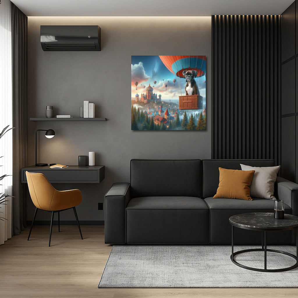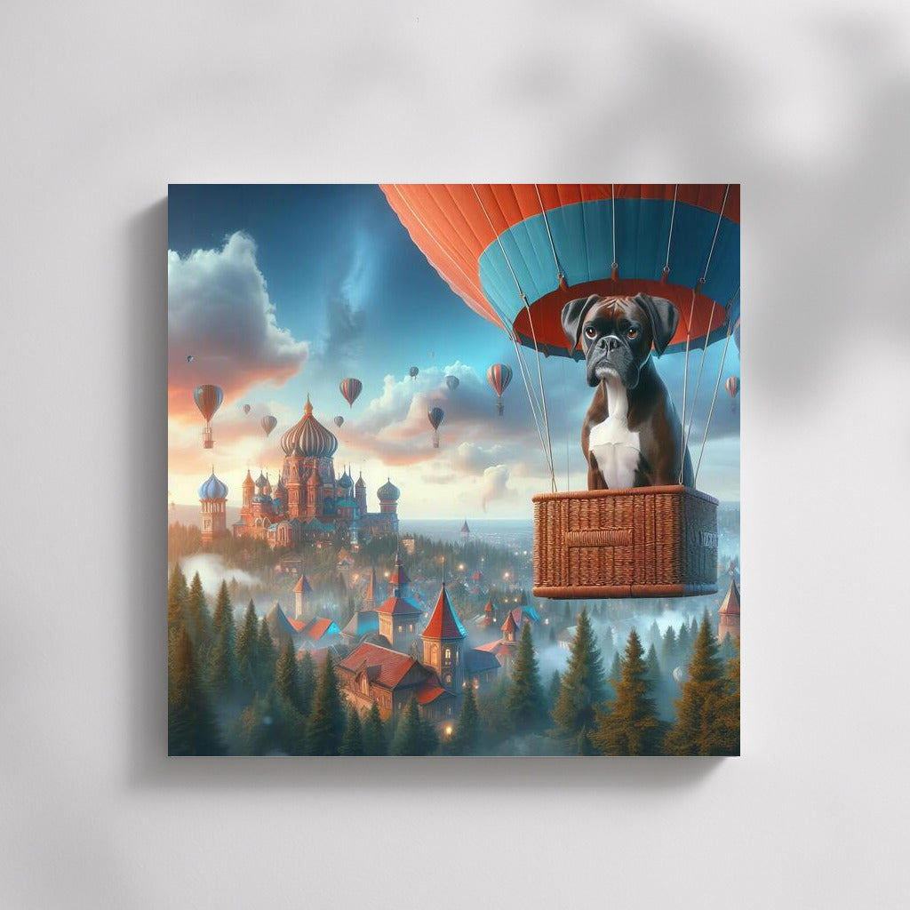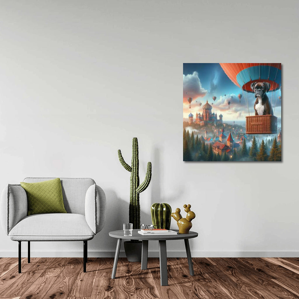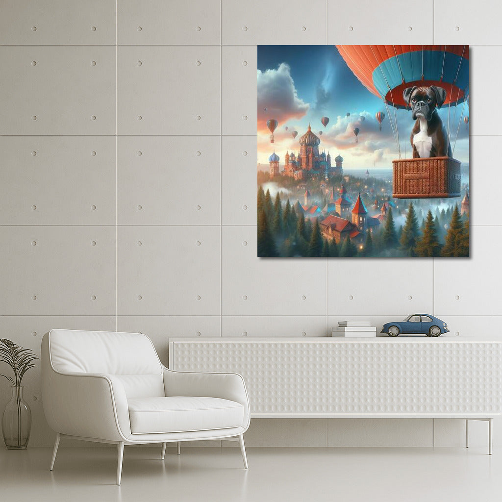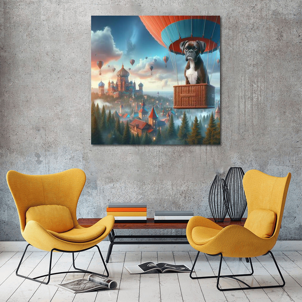 Poster: Boxer in a hot air balloon soars above a fairytale town. Amazing wall art for dreamers and seekers! See more from the collection: Animals Art
