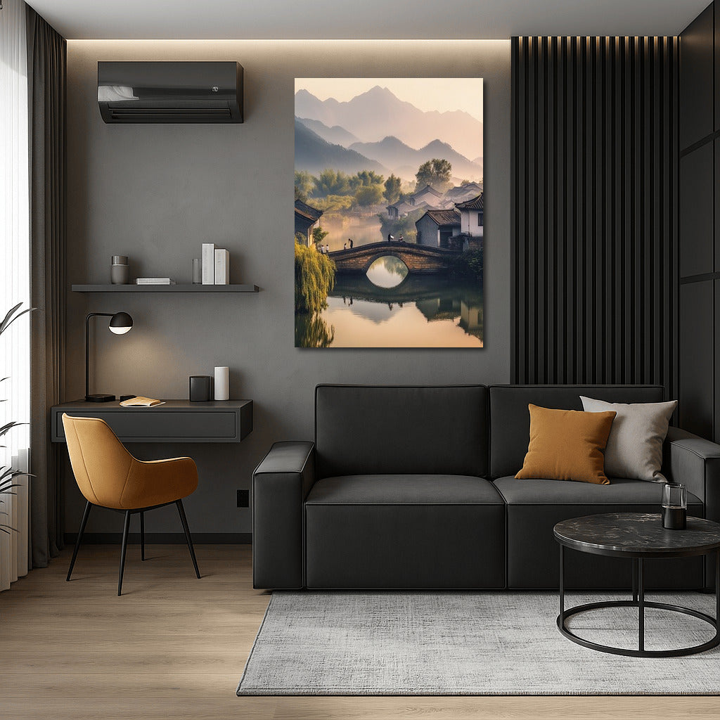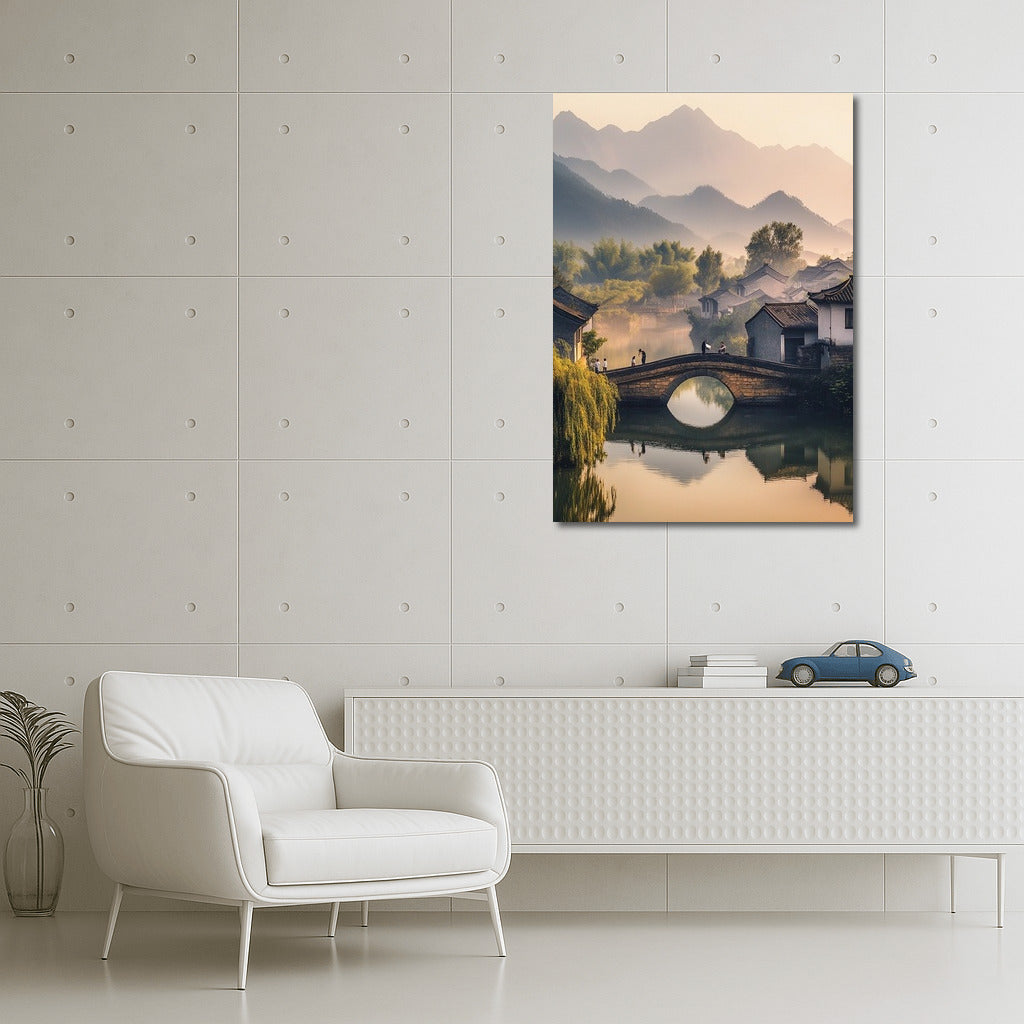 Misty morning in the mountains: scenic poster with bridge and traditional houses for inspiration and tranquility. Dream wall art. See more from the collection: Mountains & Hills Art