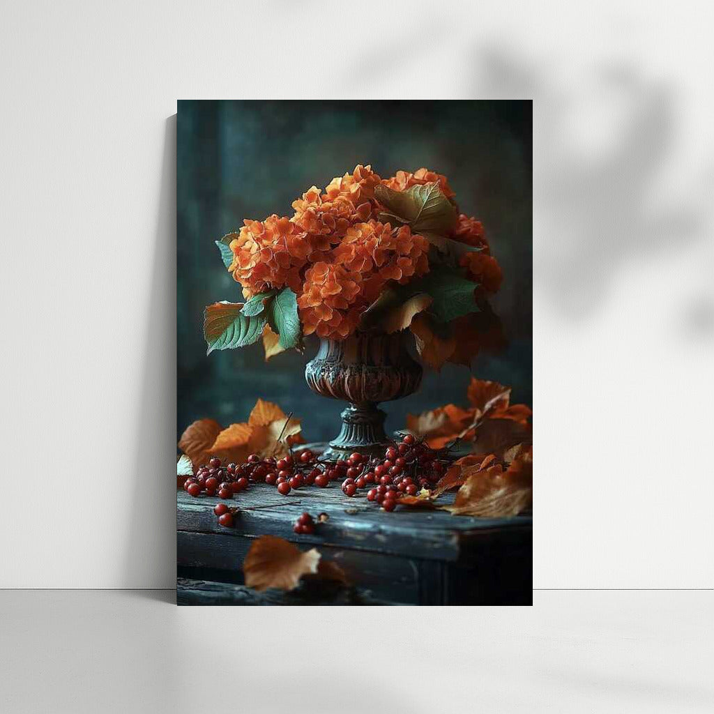 Open the world of autumn dreams with this painting: bright hydrangeas in festive decoration. A flower poster for your home! See more from the collection: Flowers Art