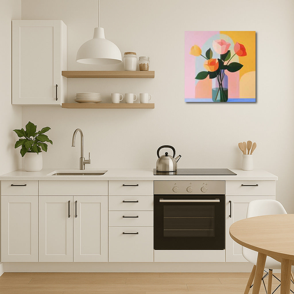 A vibrant painting of abstract roses in a vase will liven up your interior. Perfect wall art for a floral mood. See more from the collection: Flowers Art