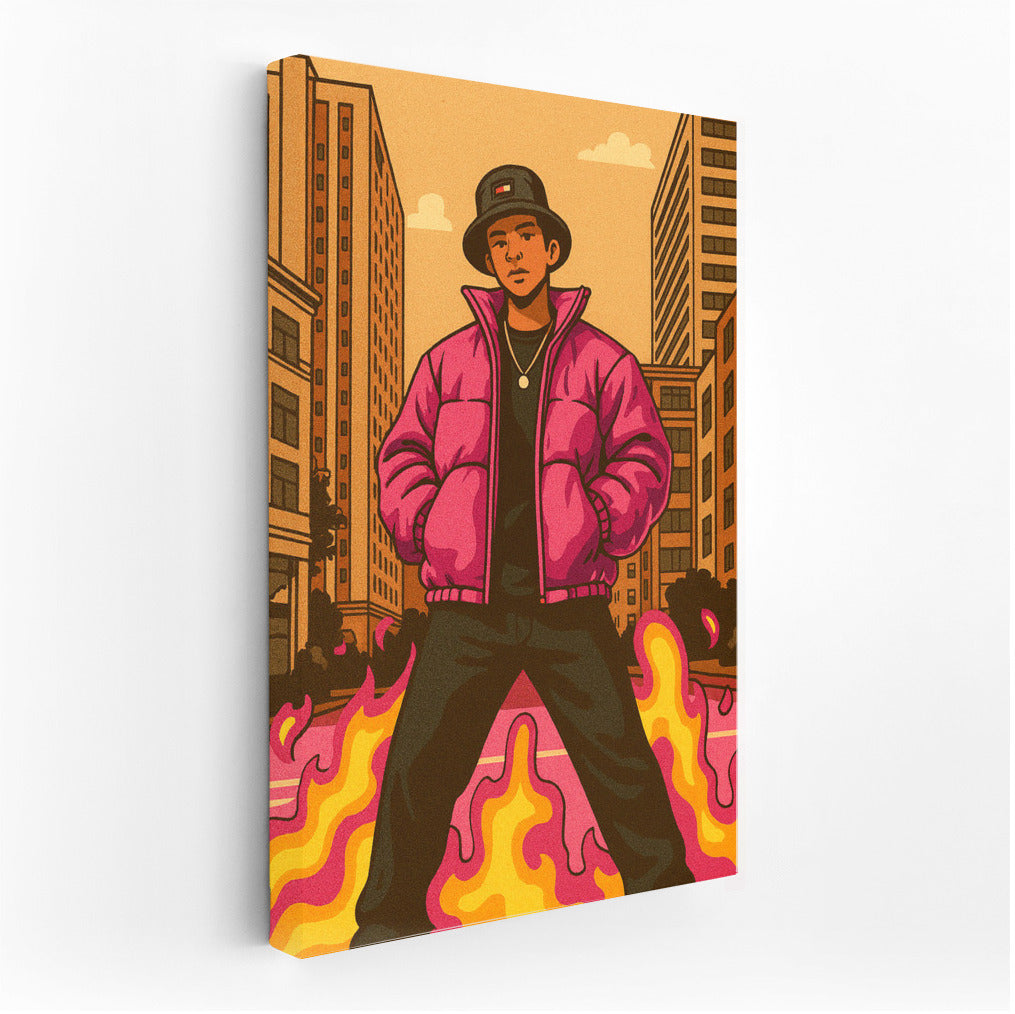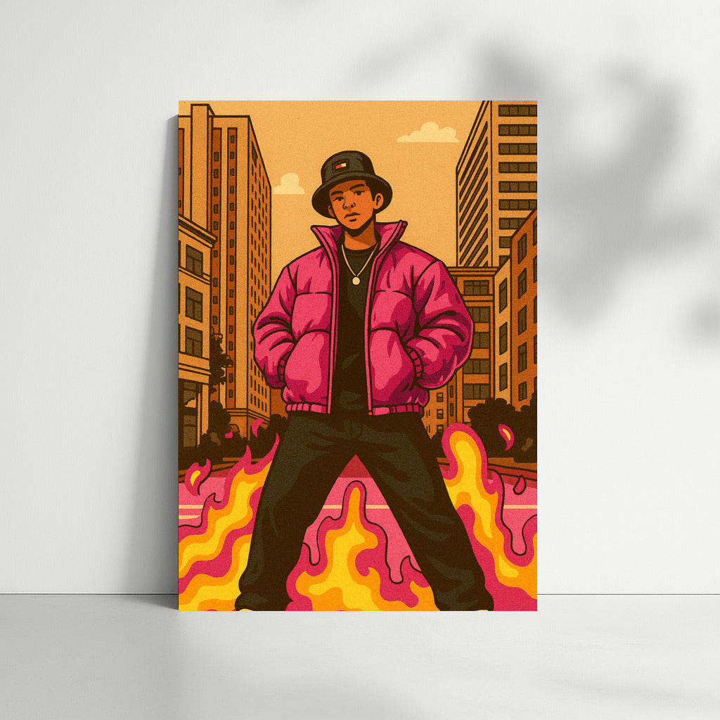 A poster reflecting Streetwear Hype Culture: a stylish character in a bright jacket stands against the backdrop of a modern city and blazing energy. See more from the collection: Streetwear & Hype Culture Art