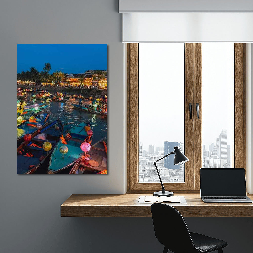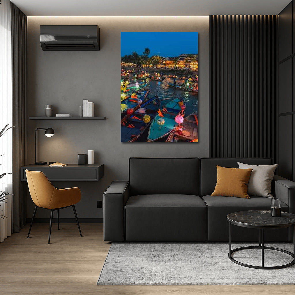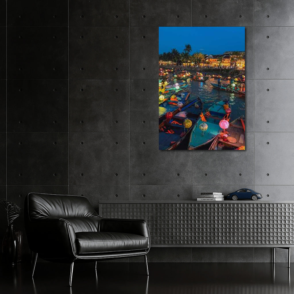 The bright lights of Vietnam's floating market invite you into a dream world. This poster will be a bright accent for your space. See more from the collection: Country Art