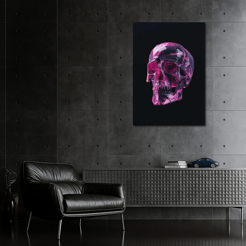 A bright pink skull on a black background is a stylish poster that will add mystery and modern chic to your interior. See more from the collection: Skull Art