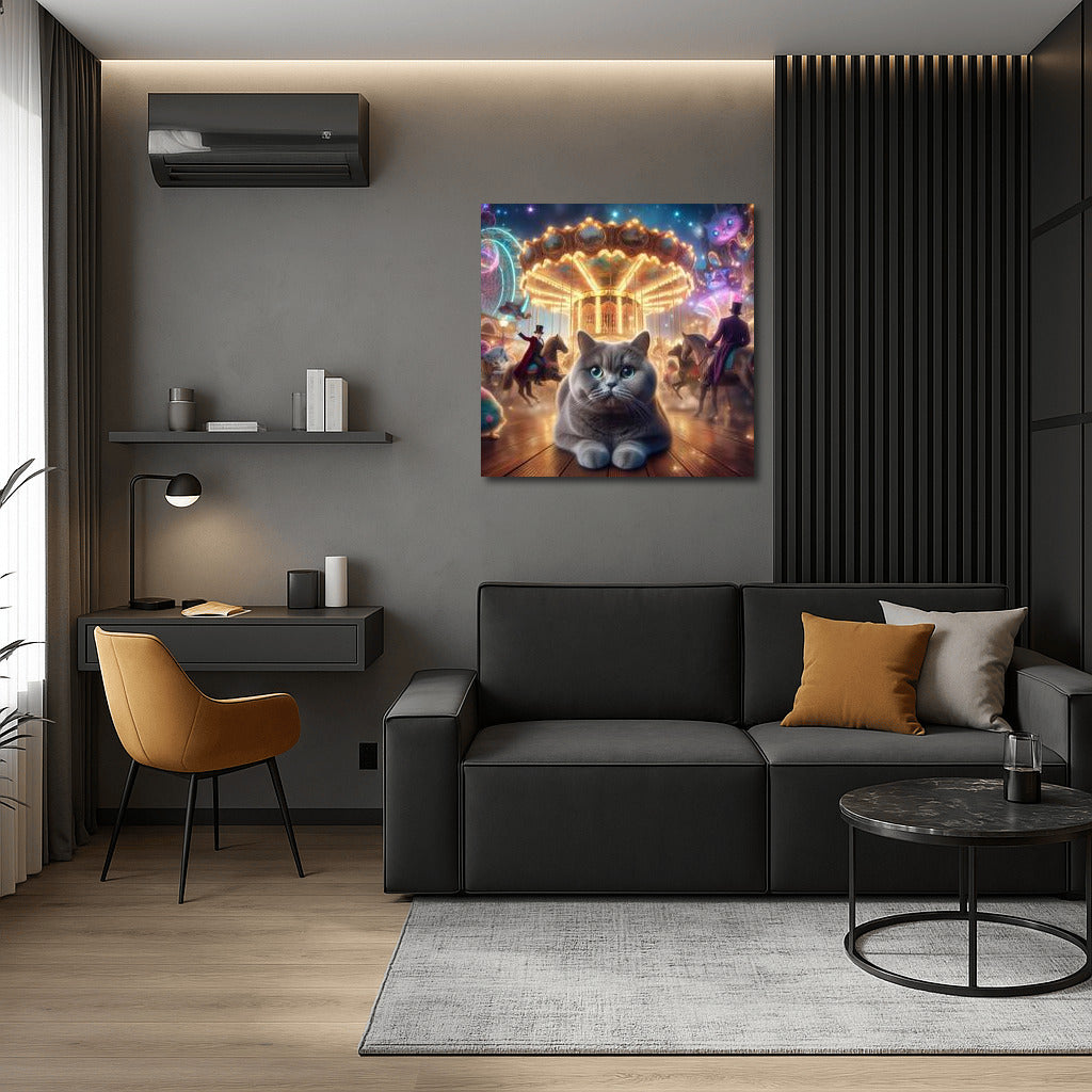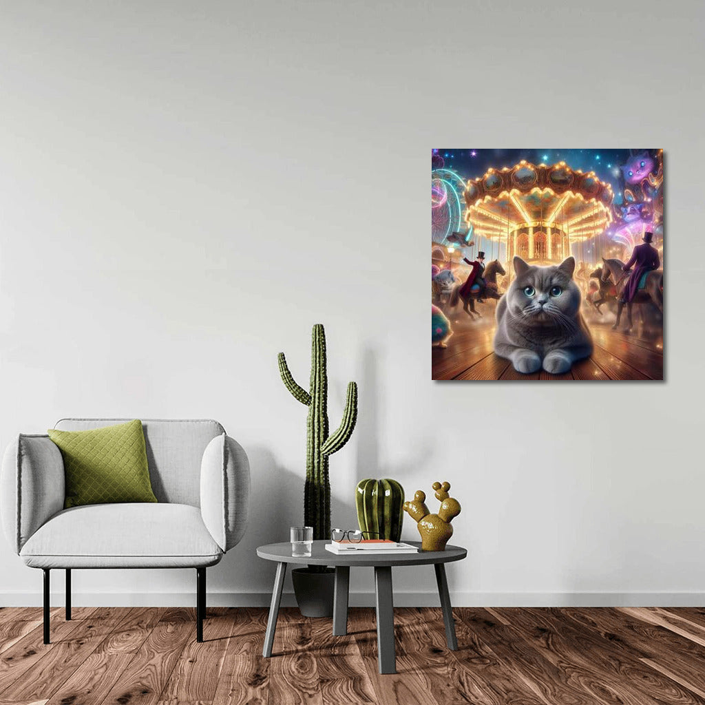 British Shorthair cat poster in wonderland: magic, bright carousels, mysterious magicians - fantasy wall art. See more from the collection: Animals Art