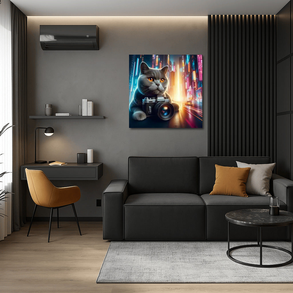 Cat photographer in a futuristic city. Dive into the unique world of wall art with a British Shorthair on a poster. See more from the collection: Animals Art