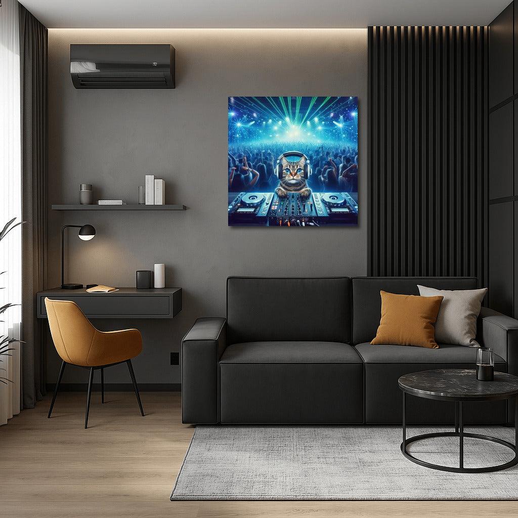 Get into the groove with this poster: British Shorthair cat as a DJ at a party, surrounded by laser lights and a dancing crowd! See more from the collection: Animals Art