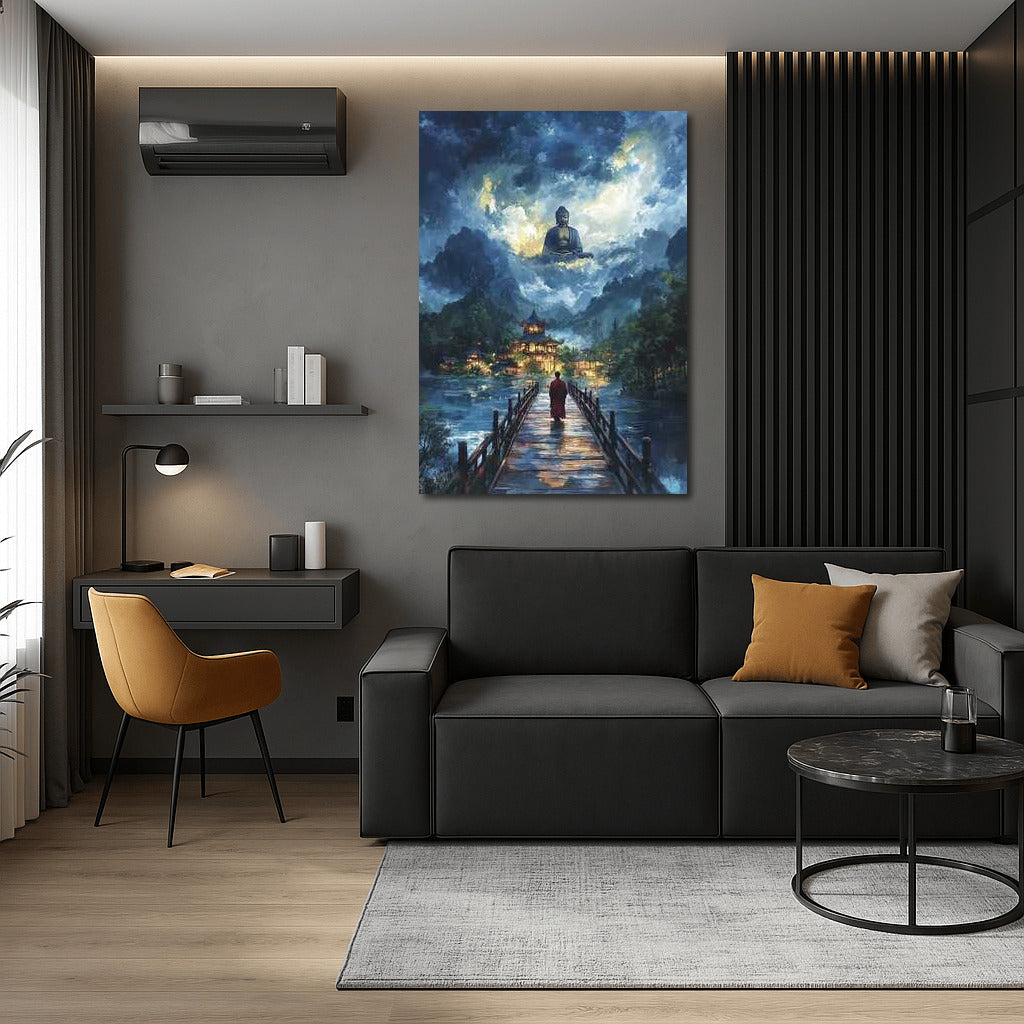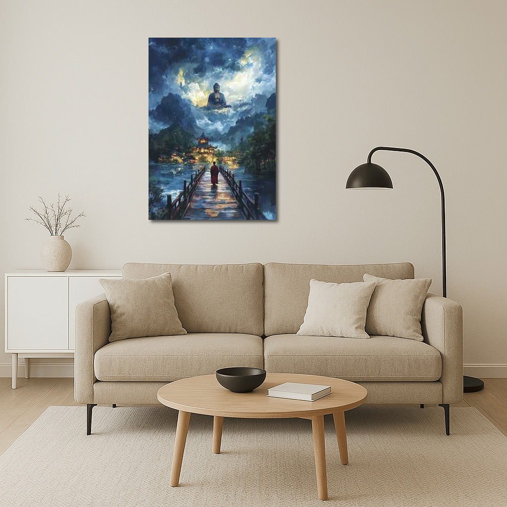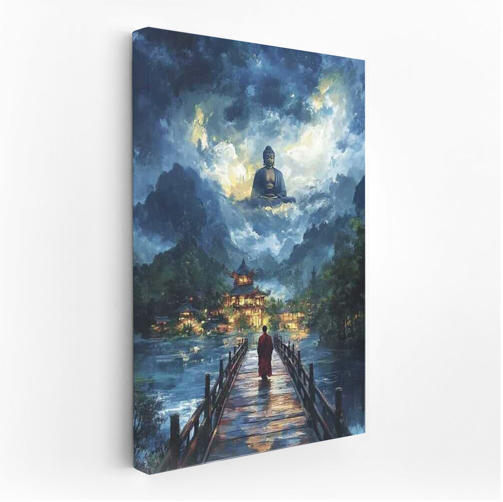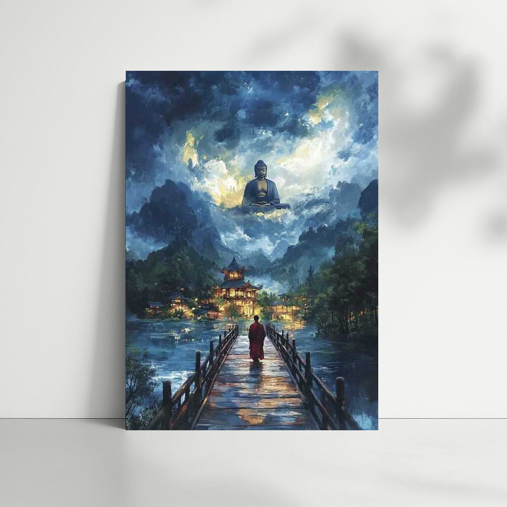 Dive into a world of serenity with this painting. The image of Buddha towers over a secret temple, transforming your wall art. See more from the collection: Buddhism Art