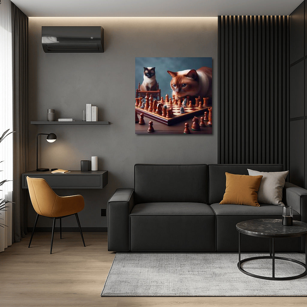 Chess battle comes to life on the poster: Burmese cat and living figures in a captivating wall painting. Magic and play! See more from the collection: Animals Art